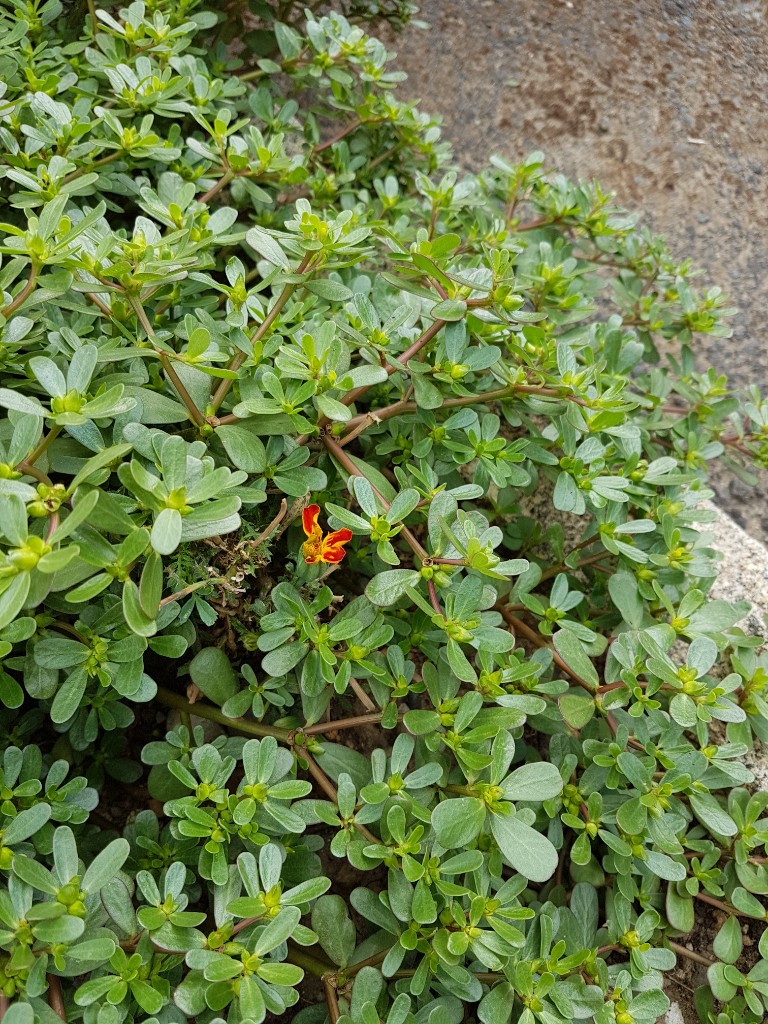 Cette plante en pièce jointe est apparue naturellement cette année dans un carré de terre extérieur devant la maison. Elle fait 10 à 15cm avec des petites feuilles vertes et aujourd'hui une fleur... La plante s'etale au sol. Nous nous demandons ce que c'est.