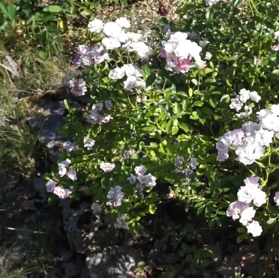 Plante d'environ 70cm de haut avec de nombreuses fleurs qui ressemblent à des roses blanches/rosées.
