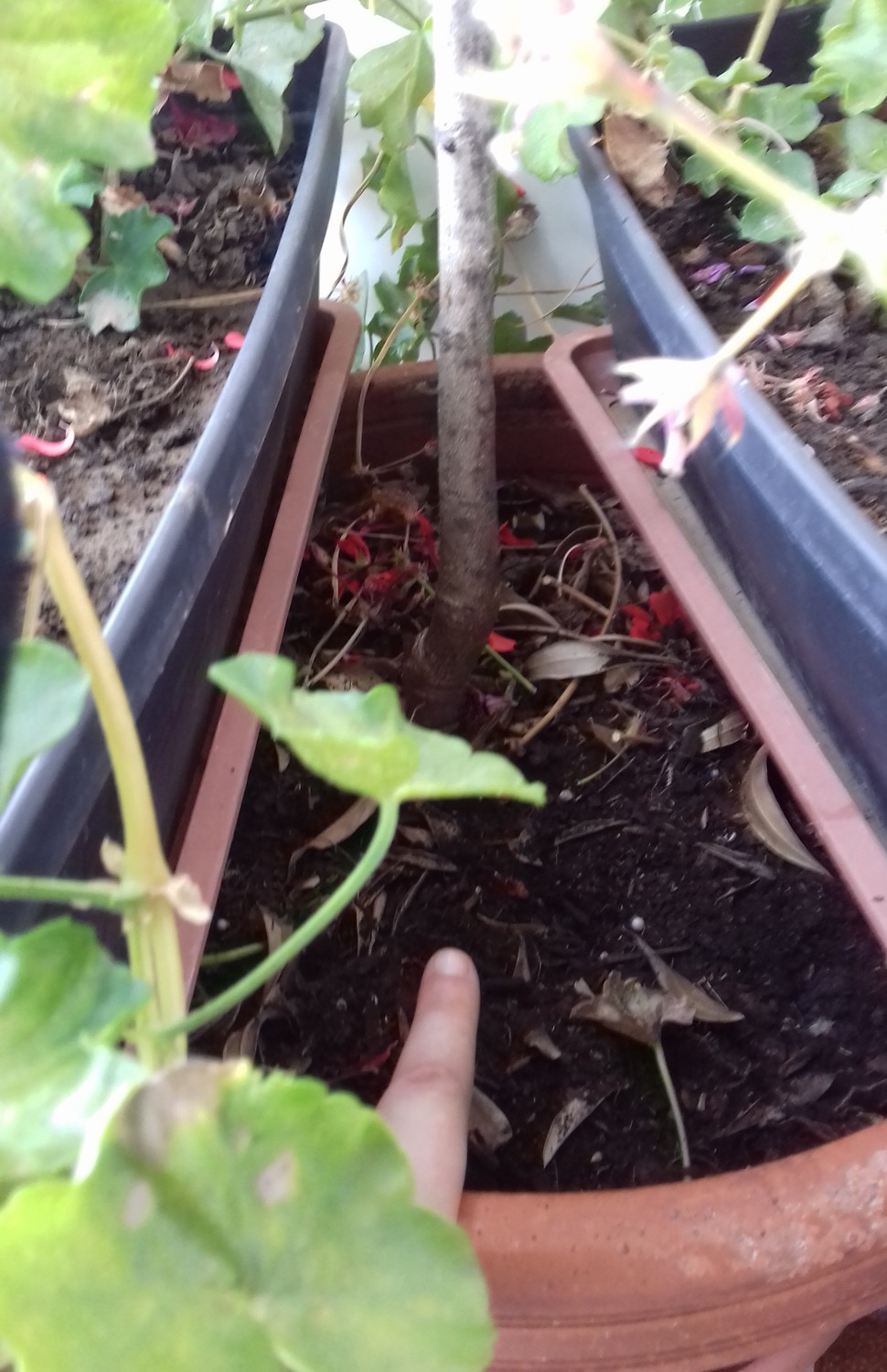 Les deux photos suivantes c'est pour que vous ayez un visuel de la qualité de la terre de Rodrigue, et la taille de son pot (c'est mon doigt pour donner une échelle). Je dirais à peu près 50cm de diamètre mais je n'ai pas le compas dans l'oeil. Si il y a des géraniums posés dessus (que je garde pour quelqu'un d'autre), c'est pour empêcher le chat d'aller le visiter... il a sans doute de bonnes intentions, il s'est peut être dit que les bons sels minéraux dans sont urine seraient un plus pour Rodrigue, mais j'ai préféré l'en empêcher...