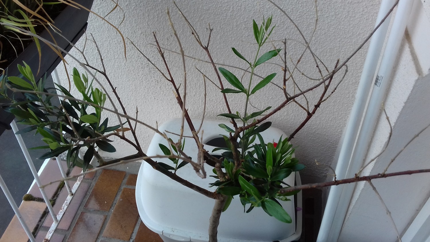 Fin juillet (ou fin juin je ne sais plus), j'ai récupéré sur le balcon de mon appartement ce qui m'apparaissait être une branche morte plantée dans un pot d'engrais. La pauvre bête avait passé 5 mois dans le noir quasi absolu et il lui restait UNE branche avec des feuilles verts pâles toutes racornies.