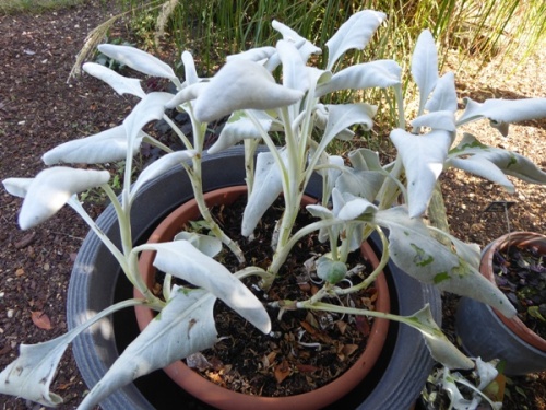 Bien que placé en hauteur et dans un pot, les feuilles sont grignotées, certaines n'ont plus cet aspect duveteux.