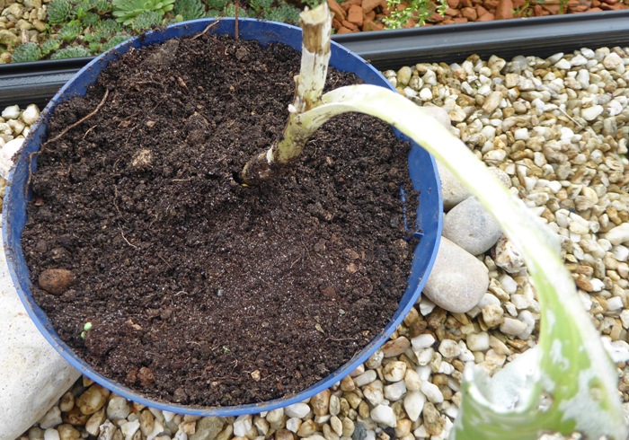 Le pot de sorte que ses racines soient juste recouvertes de compost de cactus Ă  mi-chemin dans un pot de 9 cm.