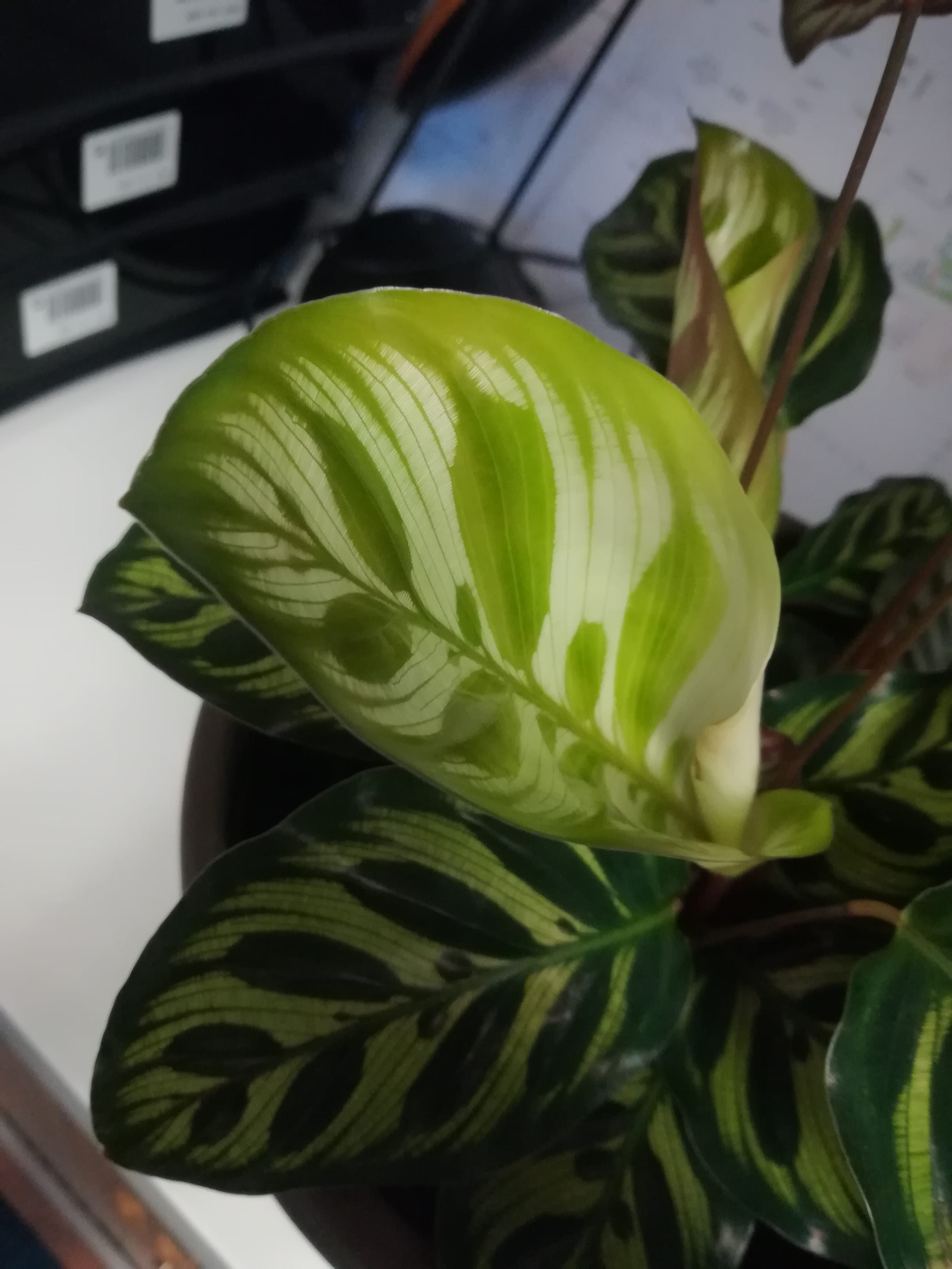 Les feuilles fraîchement développées sont souvent plus claires, elles foncent relativement rapidement une fois complètement ouvertes. Si ce n'est pas le cas c'est qu'il manque de lumière. Les Calathéas apprécient les zones sans lumière directe mais ils ont besoin d'un minimum tout de même.