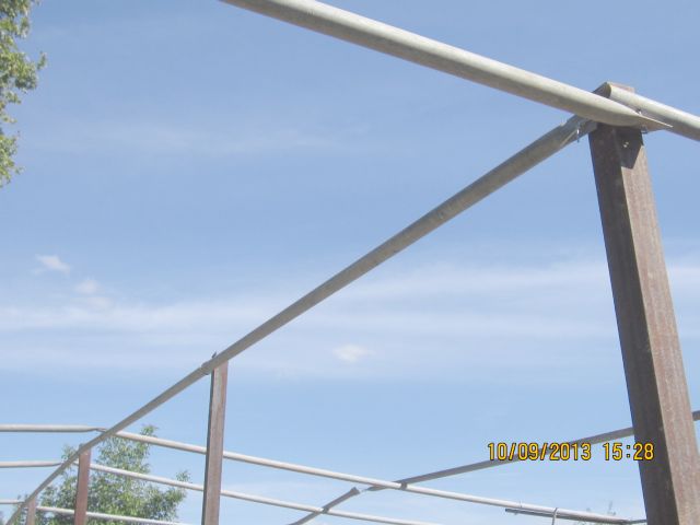 Dessus les barres (tubes de 3 m de chaque côté du toit) est posé un grillage large mailles) puis le premier plastique, puis des palettes à papier (larges et peu de bois et légères), puis le plastique extérieur.