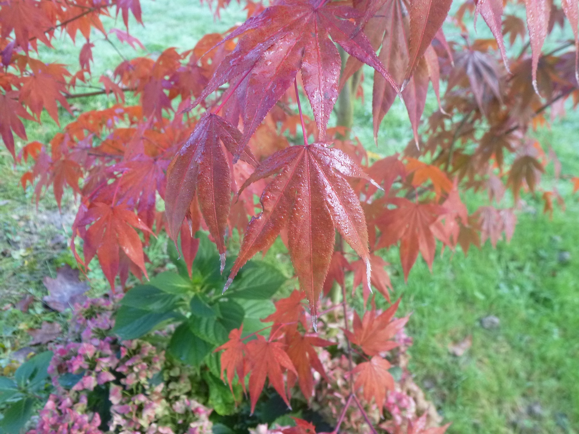 Je l'aime, il est beau..., il débourre bordeaux très foncé, puis tend vers le vert en été, pour passer au pourpre et maintenant il prend des tons orangés, il a encore toutes ses feuilles.