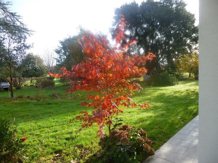 Si ton sol est un peu calcaire , Acer Freemanii autumn blaze est un arbre un peu plus grand qui pousse très bien au soleil et se colore tôt en fin d’été de toutes les couleurs.