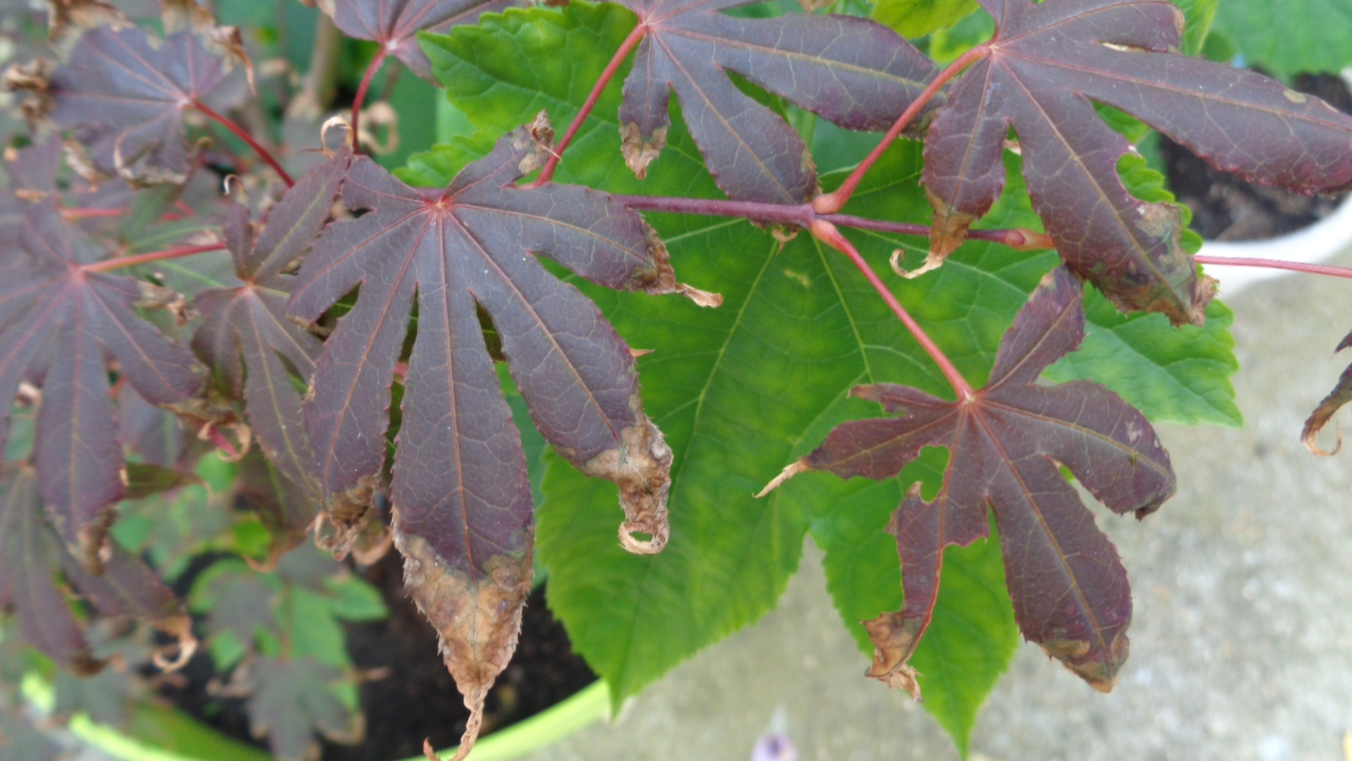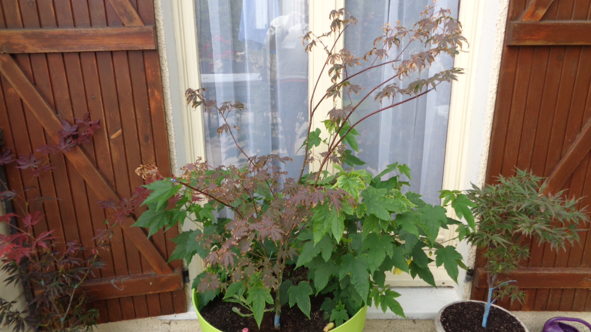 Vos érables sont magnifiques . Le mien a était rempoté une première fois cette année le 15 mai . Le voyant un peu de travers je l'ai rempoté 2 semaines plus tard ... Je pensez qu'il avait eu soif mais je me suis dit qu'il ne s'entendait pas avec ces deux plantes vertes (voir photos au dessu) ; et en plus c'est du 100% terreau donc pas bon . J'espère qu'il n'est pas malade . Les racines ne sont pas très belles . Le 12 juillet , je l'ai mis dans un pot moins grand et avec 50% de drainant (bonne puzzolane 6/12 mm et 7/15 mm) et 50% de terreau + engrais or brun (algues marines) . Le troisième et dernier rempotage a était difficile , quelques racines ont cassées , mais bien sûr je n'ai pas tailler les racines . Je l'ai mis à l'ombre de mon cerisier oû il reçoit un peu plus de soleil . Je le surveille de près , il végète maintenant . Affaire à suivre .