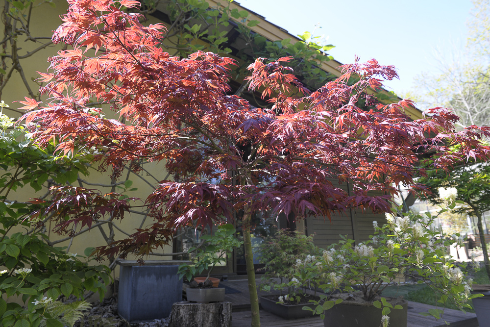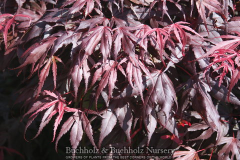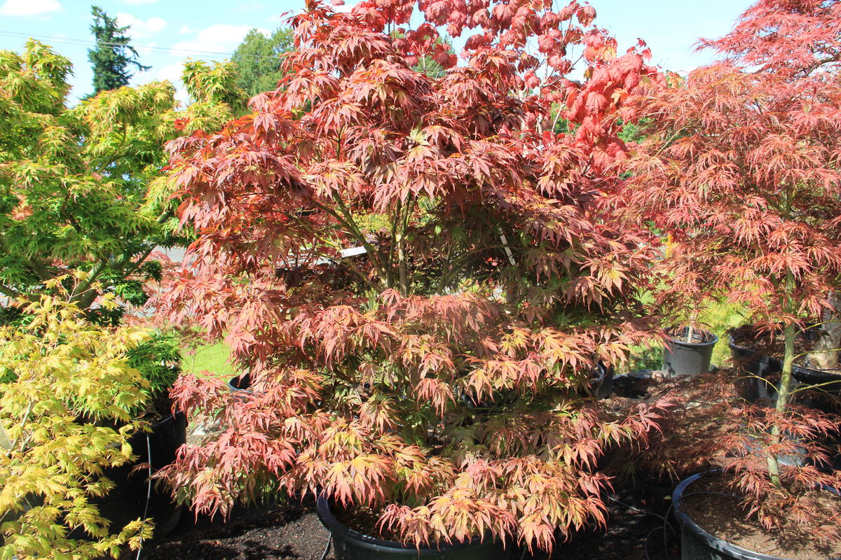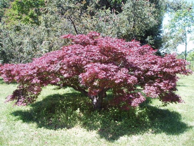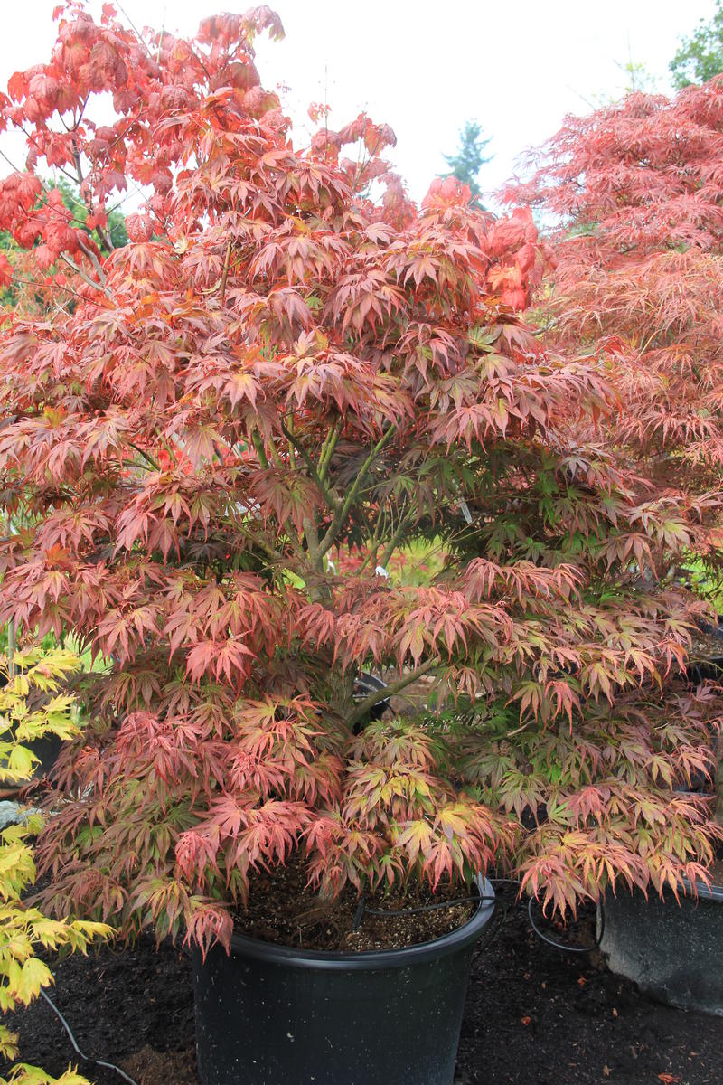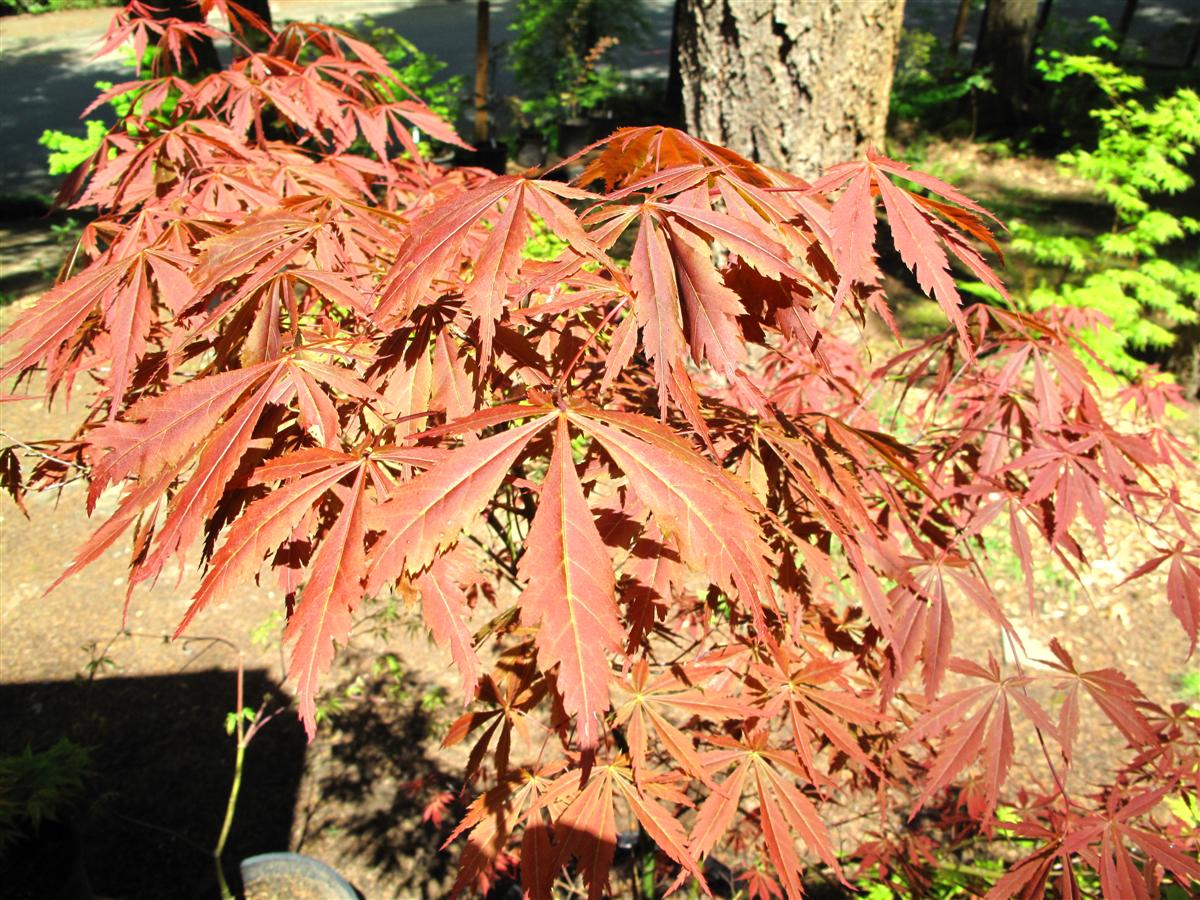 Une belle variété, qui doit plaire d'ailleurs car en rupture de stock sur le site "Bambusa". C'est une variété dont le port est naturellement large et trapu, en effet. Privé de soleil, ses feuilles deviennent rapidement vertes en été au lieu de rester rouge prune. Sa particularité, c'est de devenir progressivement rouge-orange (rouge "coucher de soleil") en avançant vers l'automne, une très belle couleur, si l'ensoleillement est suffisant. Il est signalé à plusieurs reprises que la couleur rouge-orange a du mal à tenir et se colore facilement de vert, ce qui gâche un peu le plaisir... Comme souvent, avec l'âge, la spécificité de la variété a tendance à se perdre… Allez hop sur ma liste quand même, en association avec une variété au port érigé et franchement rouge (type 'fireglow'), ou avec une variété à l'orange pur (type 'tana' ou 'hogyoku', en fait n'importe lequel des amoenum vert devenant orange en automne), le mariage peut être très réussi !