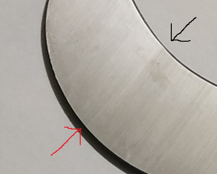 Notez que les 2 cotés de la lame comportent ces défauts mais à des hauteurs séparées d'un bon cm. Comme indiqué plus haut, le touché est le sens qui permet le mieux de se rendre compte.