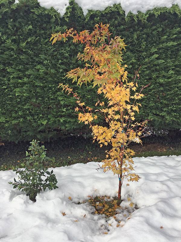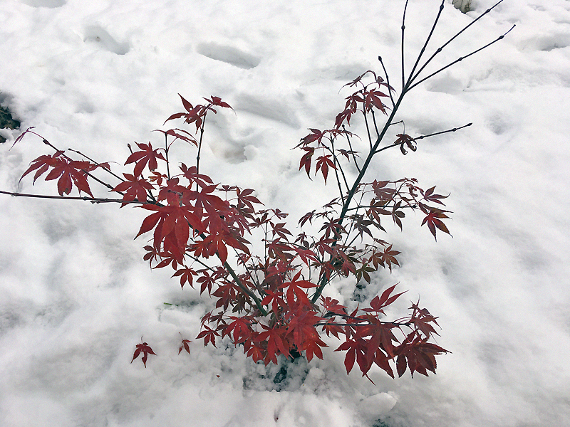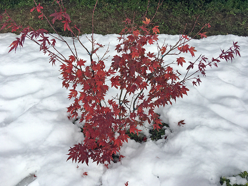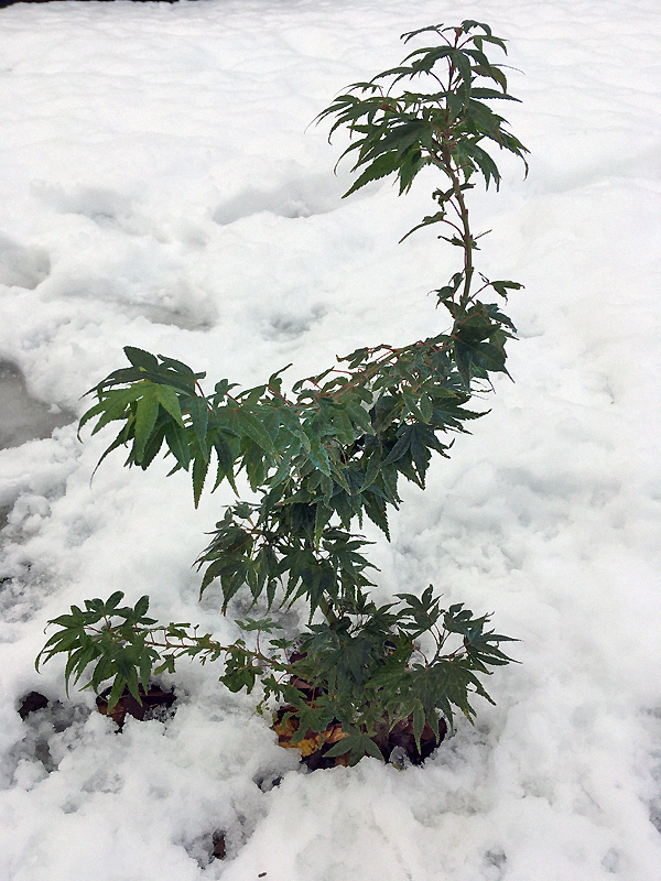 les quelques érables en terre ont pas trop souffert, pourtant la neige très lourde avait complètement enseveli petit Seiryu ....