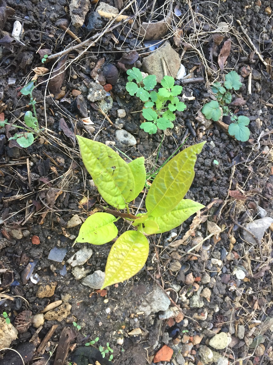 Je soupçonne cette pousse d'être une Falloperie , une des renouées du Japon ; à arracher , virer , brûler , atomiser ....
