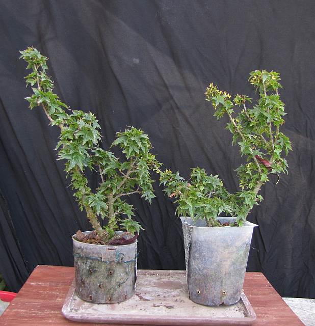 Comme mon acérophilie -voire mon acéromanie - a commencé avec le bonsaï, il s'agit d'Acer adaptés au bonsaï (taille des feuilles), et je le rempote en étalant les racines pour avoir à terme un beau "nebari" : la base du tronc, quand les racines s'étalent en étoile.