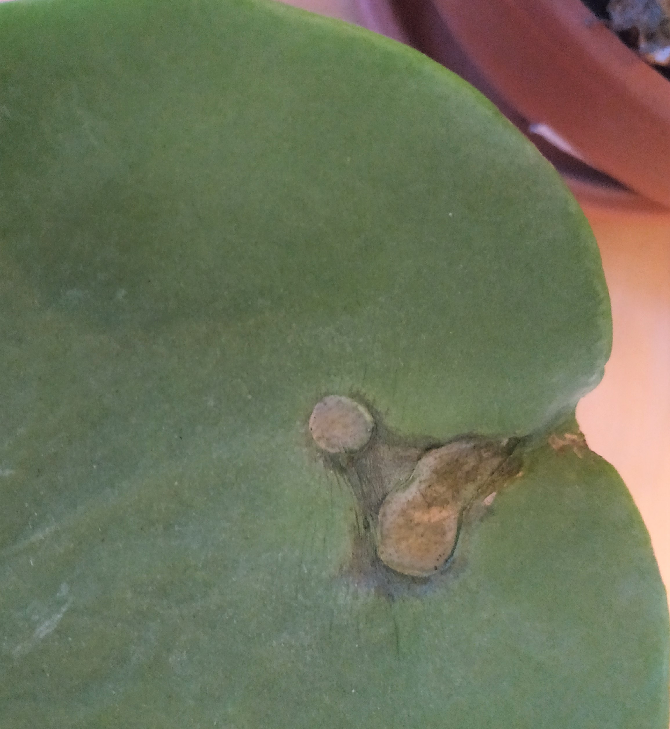 je fais appel à vous car il y a comme des trous qui se forment sur une feuille de mon kalanchoé (auquel je tiens beaucoup). C'est comme si la feuille devenait de plus en plus fine jusqu'à faire des trous marrons. J'ai l'impression que ça empire de jour en jour. J'ai mis des photos pour illustrer. La première montre le dessous de la feuille.