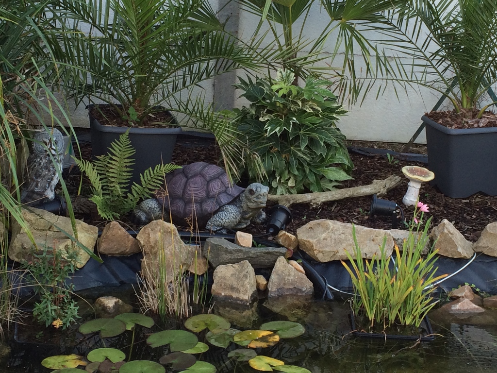 voici des photos de mon bassin, Ă lâarriĂšre du bassin je vais seulement rajouter des fougĂšres , (pas trop encombrĂ© pour faciliter l'entretien du bassin) Ici les palmiers sont en pots et rentrĂ© l'hiver. Le bambou Ă l'aarriĂšre est planter dans un bac / poubelle posĂ© sur une petite dalle de bĂ©ton pour Ă©viter tout risque , car celui-ci est traçant.
