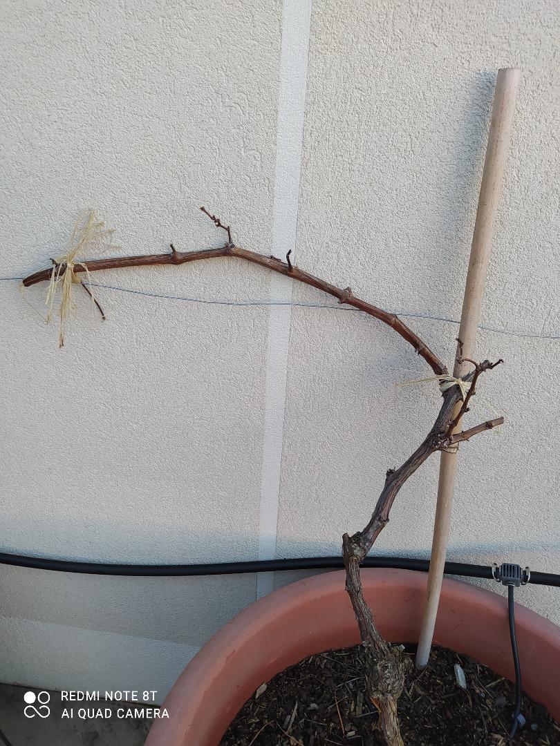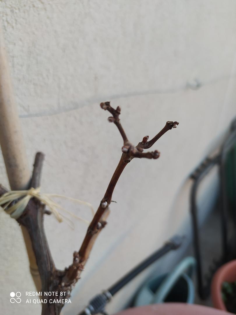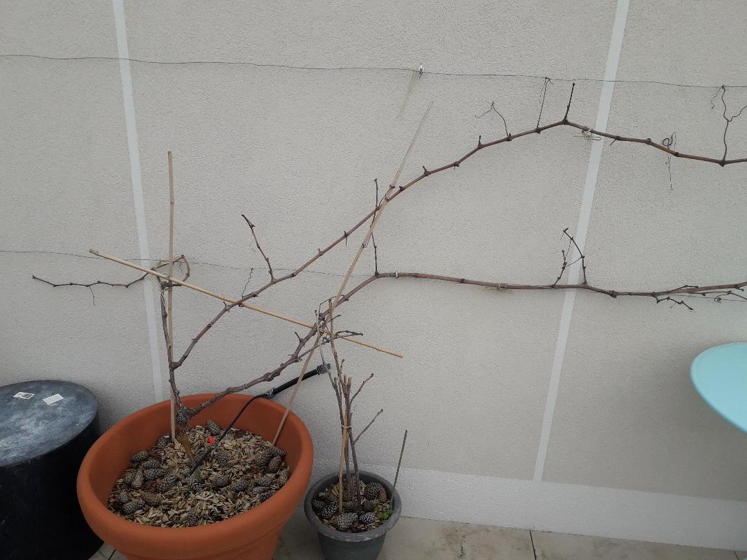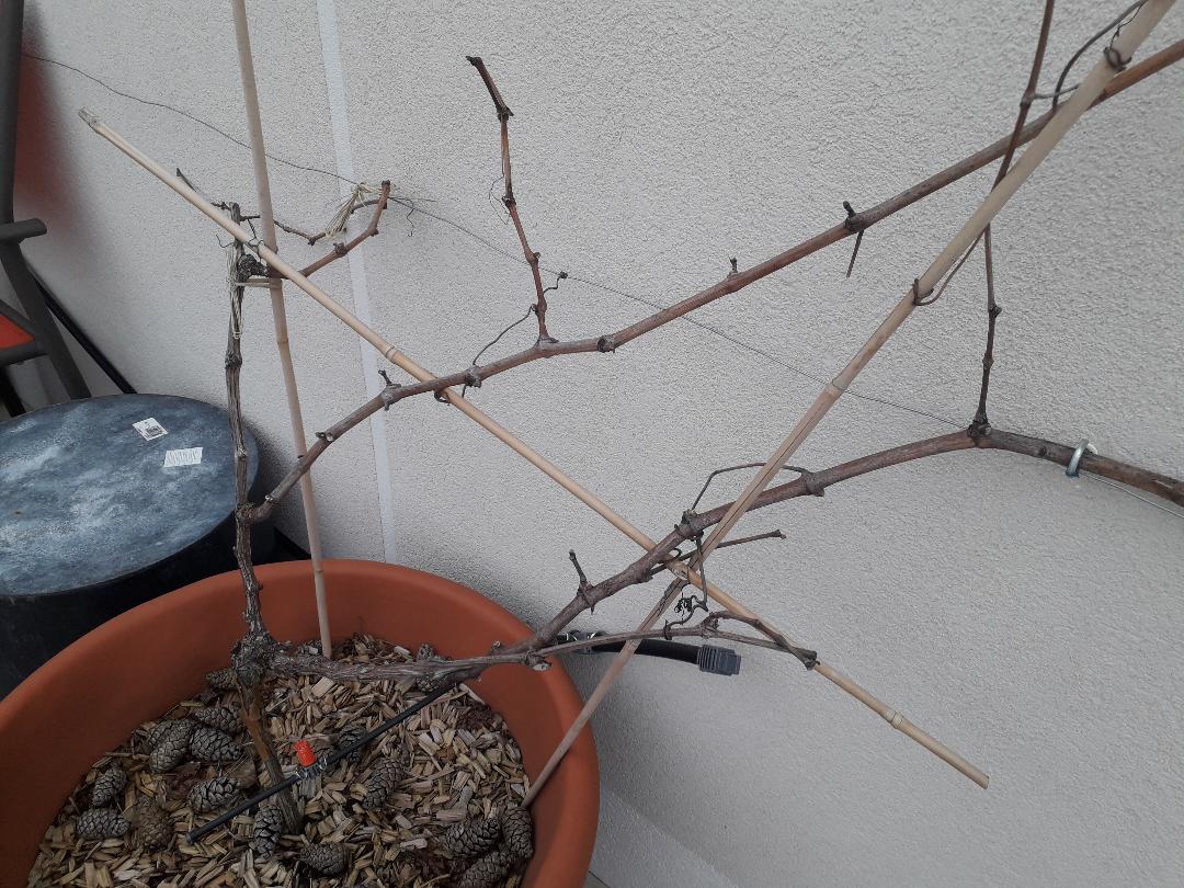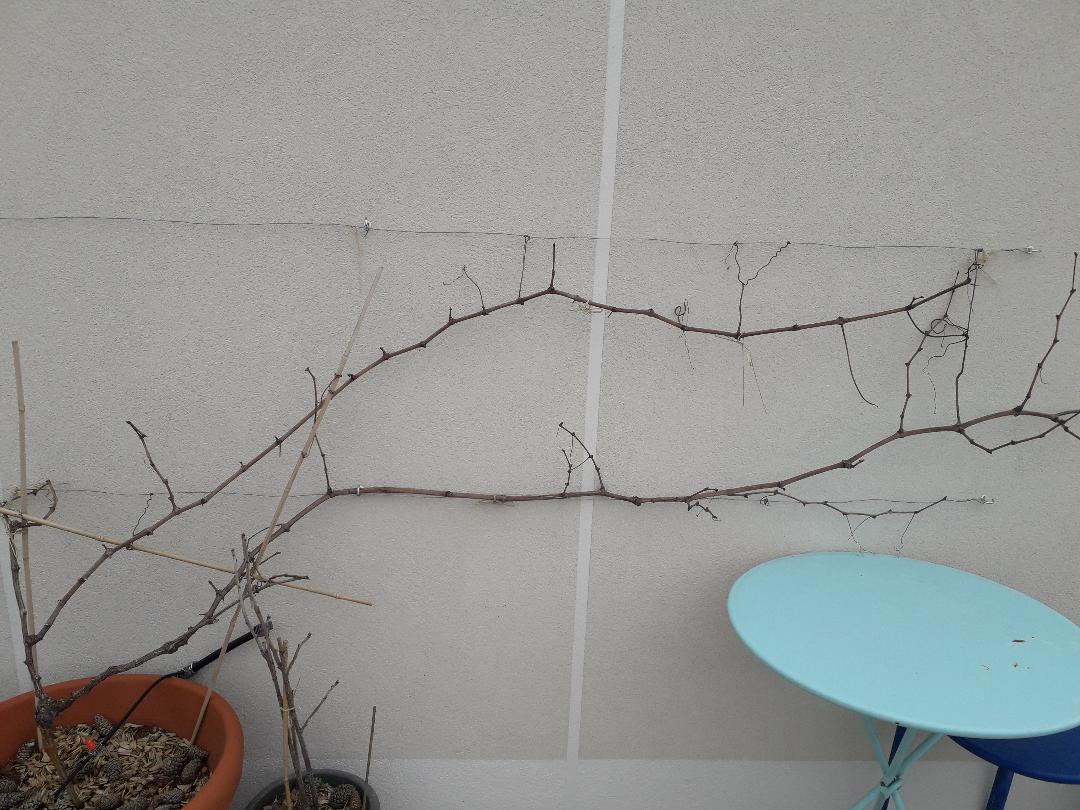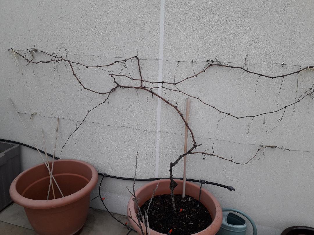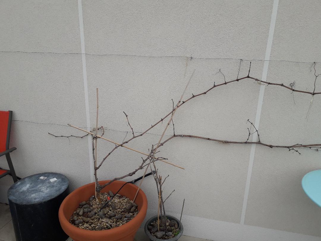 Avec la semaine de grand froid, quelques plantes ont un peu souffert. J'avoue avoir complètement oublié de protéger ma vigne...j'avais en tête que la vigne était résistante sauf qu'elle est en pot et ce n'est pas exactement la même chose...le pot est surélevé donc les racines ne touchent pas directement le froid du sol mais a t elle quand même souffert? j'aurais besoin de votre avis. J'ai l'impression que les petits bourgeons sont cramés sur la tige zoomée.? concernant la tige de gauche je ne vois pas de bourgeons. Est ce normal?