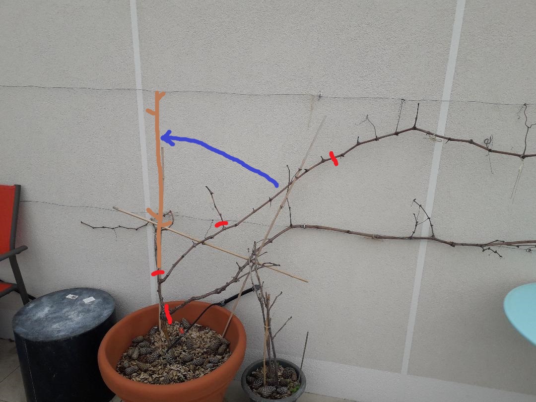 Je suis grande débutante! J'ai planté une vigne en pot il y a 1 an. Il s'agit d'un chasselas doré. Comment dois je le tailler? La seule chose que je sache c'est qu'il faut une taille à 2 yeux mais ca ne me parle pas beaucoup. J'ai regardé sur internet, on parle de charpentières etc..mais ca reste très abstrait pour moi! est ce que quelqu'un accepterait de me guider sur mes photos en indiquant où il faut que je taille?