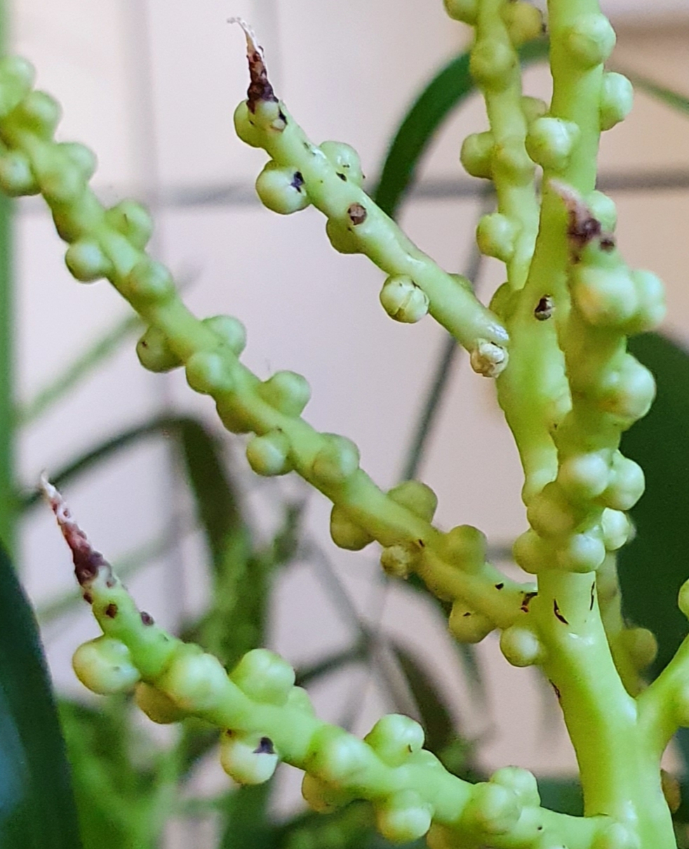 Le bout noir, peut être un petit manque d'eau pendant la formation des "épis"... C'est déjà exceptionnel que tu arrives à avoir une floraison, c'est rare avec cette plante.