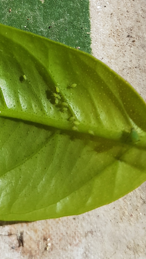 2- Des espèces de minuscules "pucerons verts" se trouvaient aussi sur la face inférieur (celle qui n'est pas exposée au soleil) de certaines feuilles (voir image en pièce jointe). Ces feuilles d'ailleurs finissent toutes recroquevillées (elles s'enroulent sur elles-mêmes et deviennent plus dures).