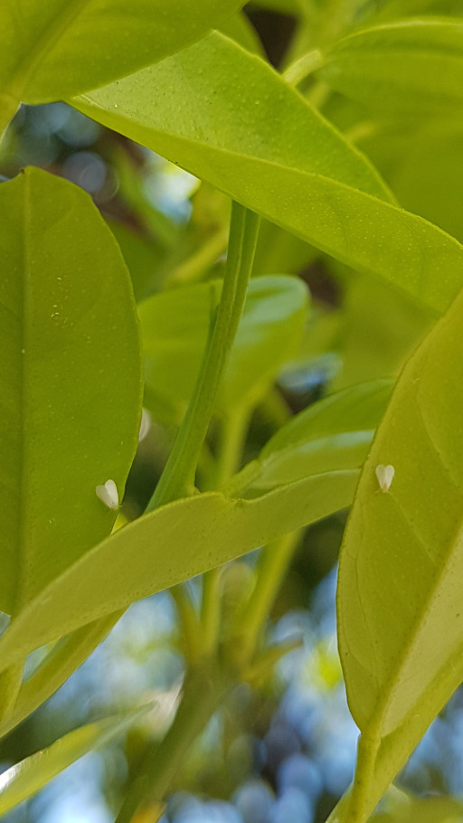 1- Des espèces de petites mouches minuscules blanches étaient déposées surtout sur la face inférieure des feuilles (voir image en pièce jointe)