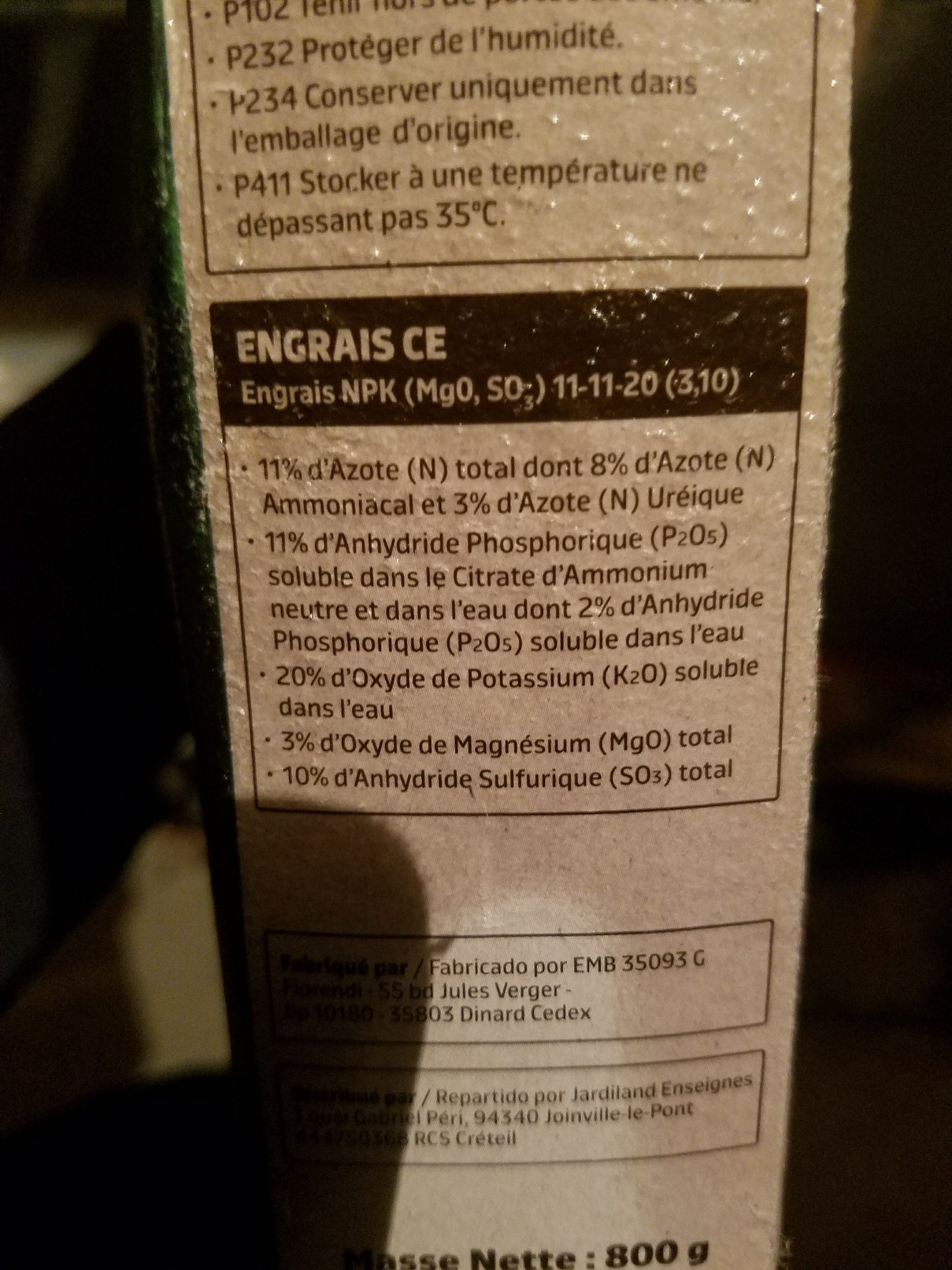 Je viens de retrouver sur mon étagère un engrais qu'un ami m'avait donné et qui se rapproche des taux 12 12 17 conseillés par bourru.
