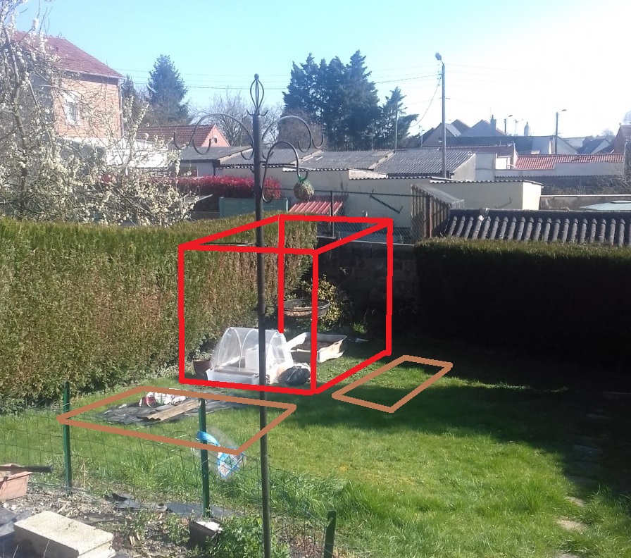En marron, l'emplacement des planches et carrés. Je vais devoir me contenter de ça. La planche entre la serre et le bassin, qu'on aperçoit au premier plan, est quand même assez grande, je dirai 4 ou 5 m2. Alors oui c'est petit mais mon jardin est petit