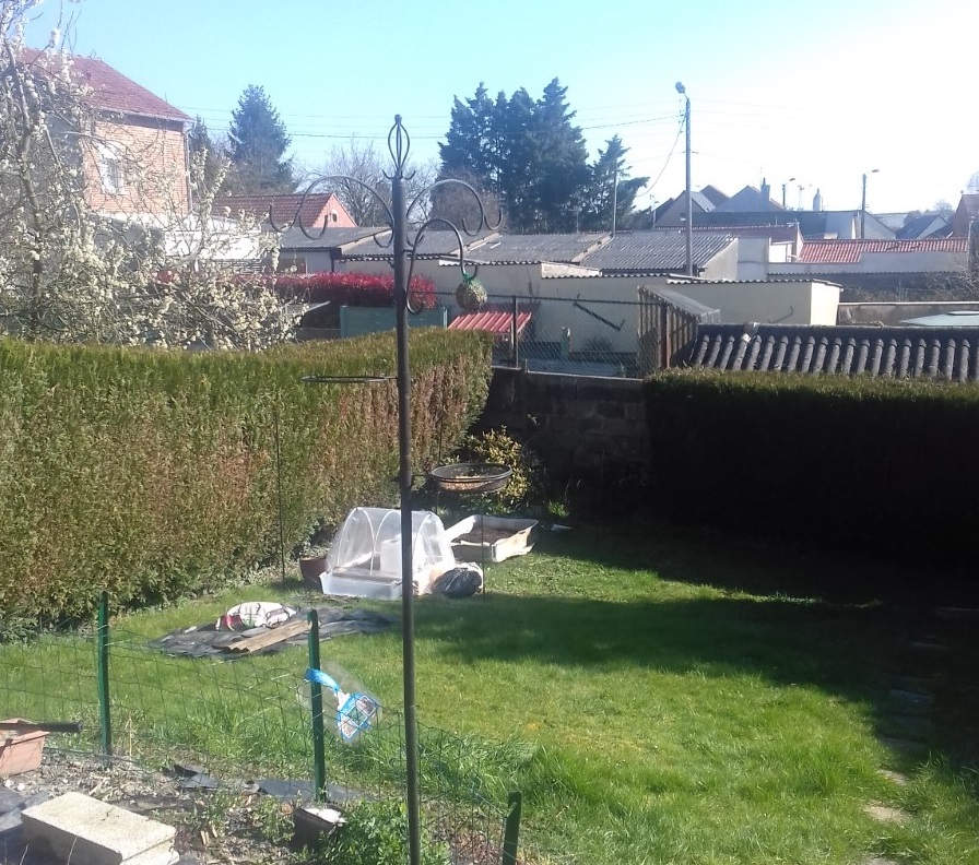 Au fond, contre le mur, à droite, il y a mon tas de compost. Dès que possible (fin du confinement) je mettrai un vrai composteur pour abriter le tas de la pluie.