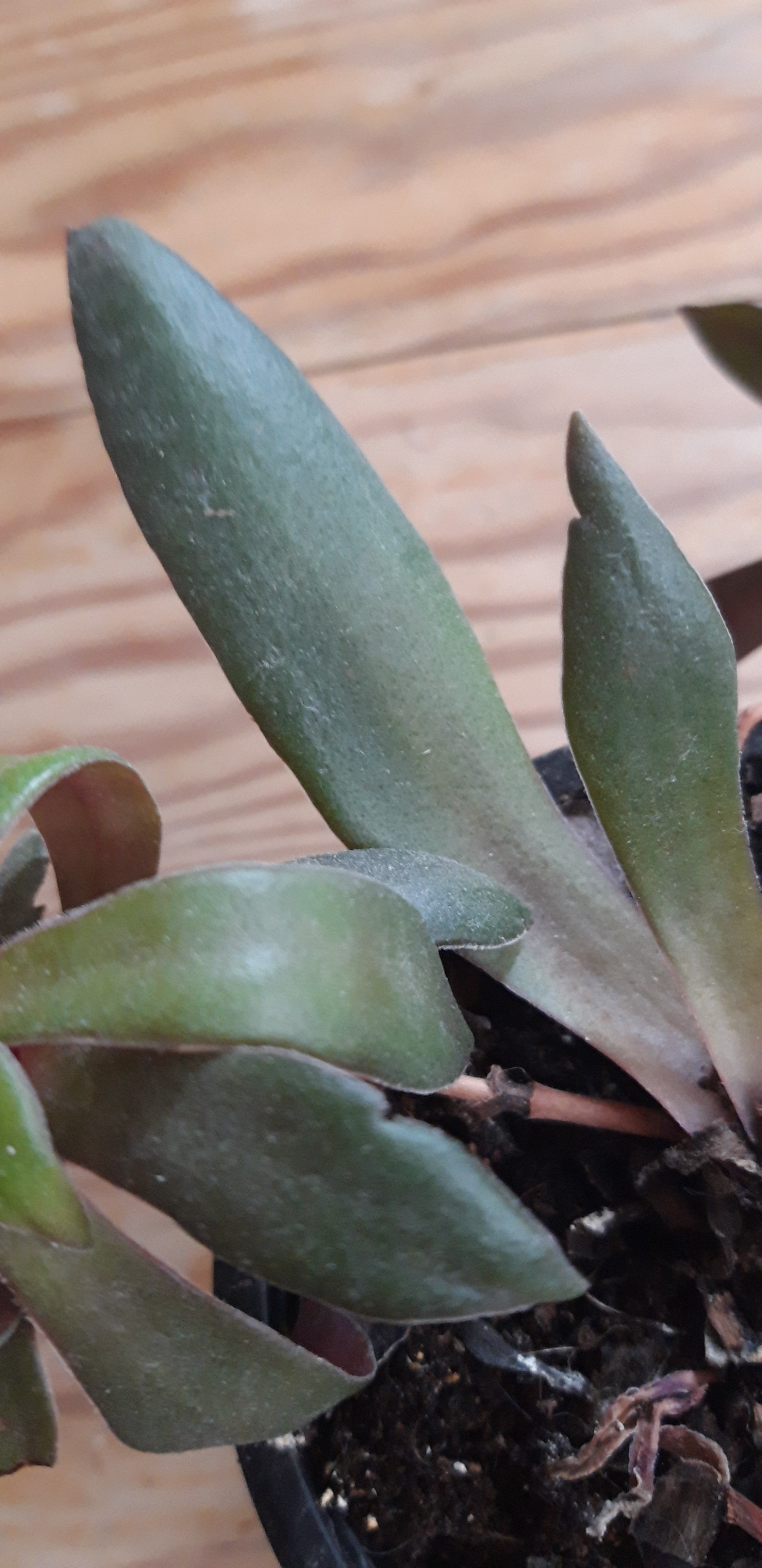 Les feuilles sont charnues, mais assez fine pour une succulente. Elles sont vertes foncées sur leur dessus, et pourpre en dessous.