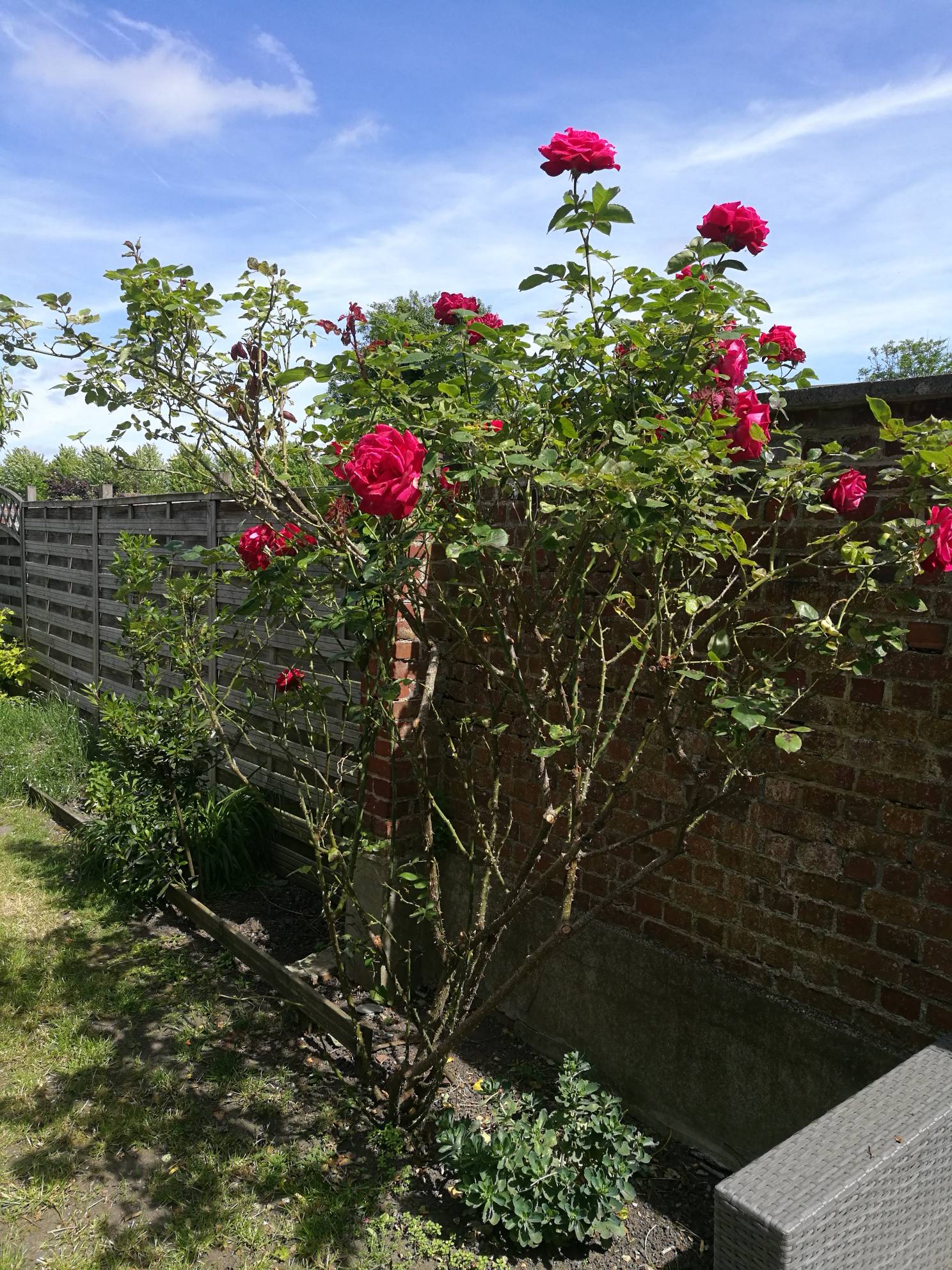Le rosier d'Alexis ressemble plus à un arbustif que buisson vu sa hauteur par rapport au mur.