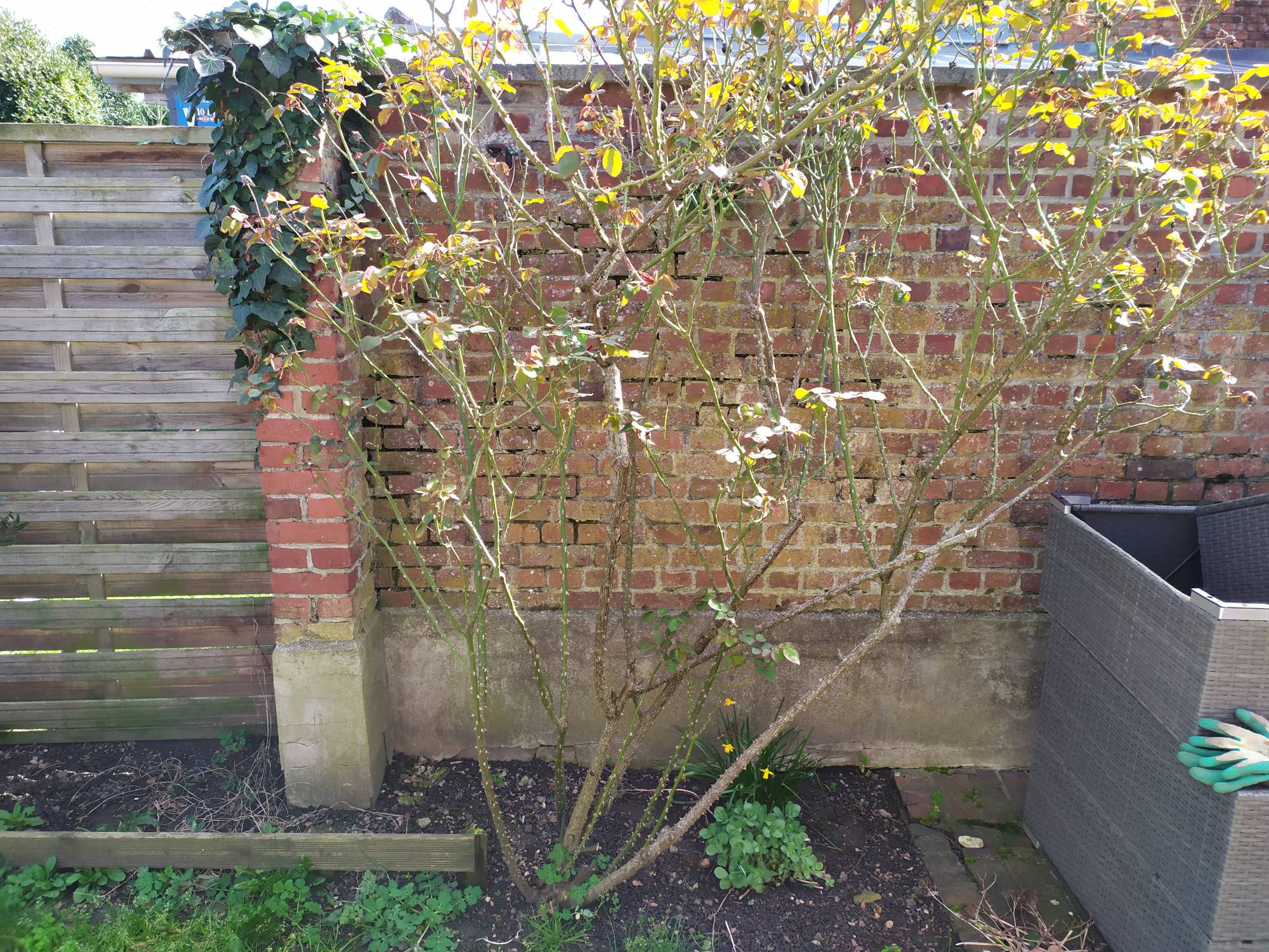 Je suis tenté tout de même de redonner un coup de jeune cette semaine j'ai l'impression qu'il n'a pas été très bien entretenu par le passé. Je distingue 3 grosses "branches" marrons qui représentent environ 2/3 du rosier actuel, mais je vois peu de bourgeon/oeil en dessous d'un mètre sur ces branches. Est-ce que le mieux serait de raccourcir à environ 50-60cm au dessus d'un oeil?
