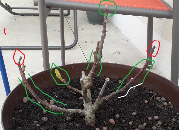 Ce matin j ai re regardé ta photo, j ai vu que certaines pointes avaient gelées (je les ai entourées en rouge) maisla base est avec un bel aspect, donc il repartira (j ai souligné en vert).