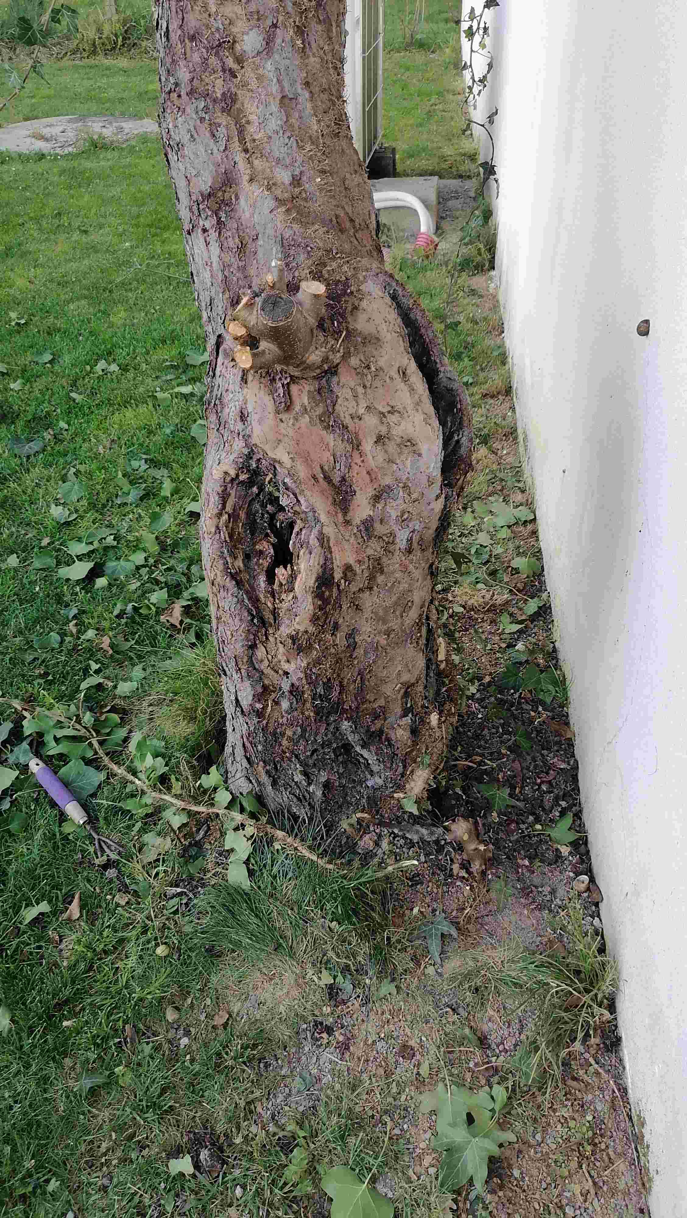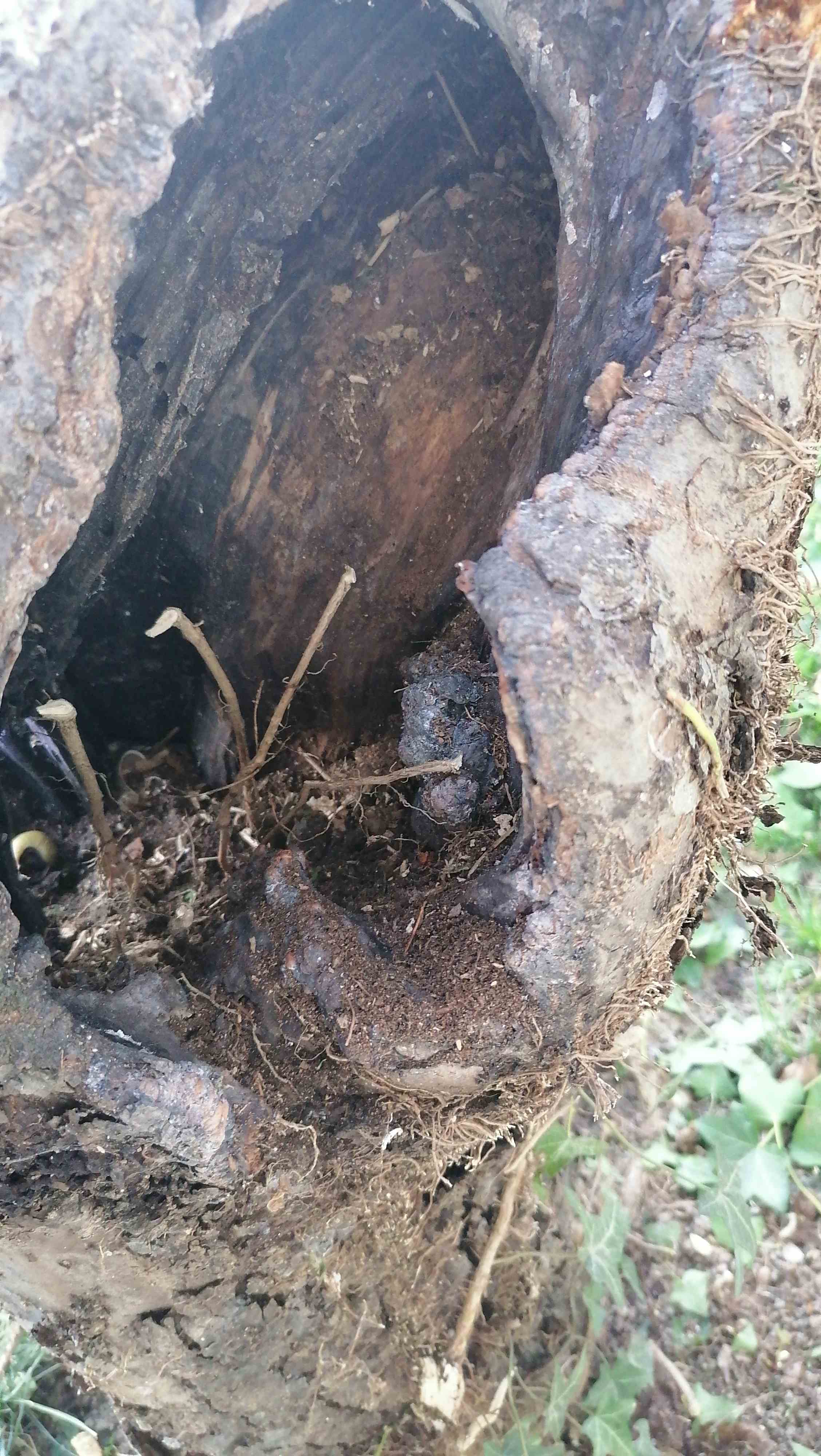 En ôtant le lierre, je me suis aperçue d'un trou béant au niveau du tronc. Il traverse le tronc de part en part. Plein d'escargot et de brindilles s'y trouvaient. Et du lierre remontait dans le trou, trou qui ne semble pas avoir de fin en remontant...