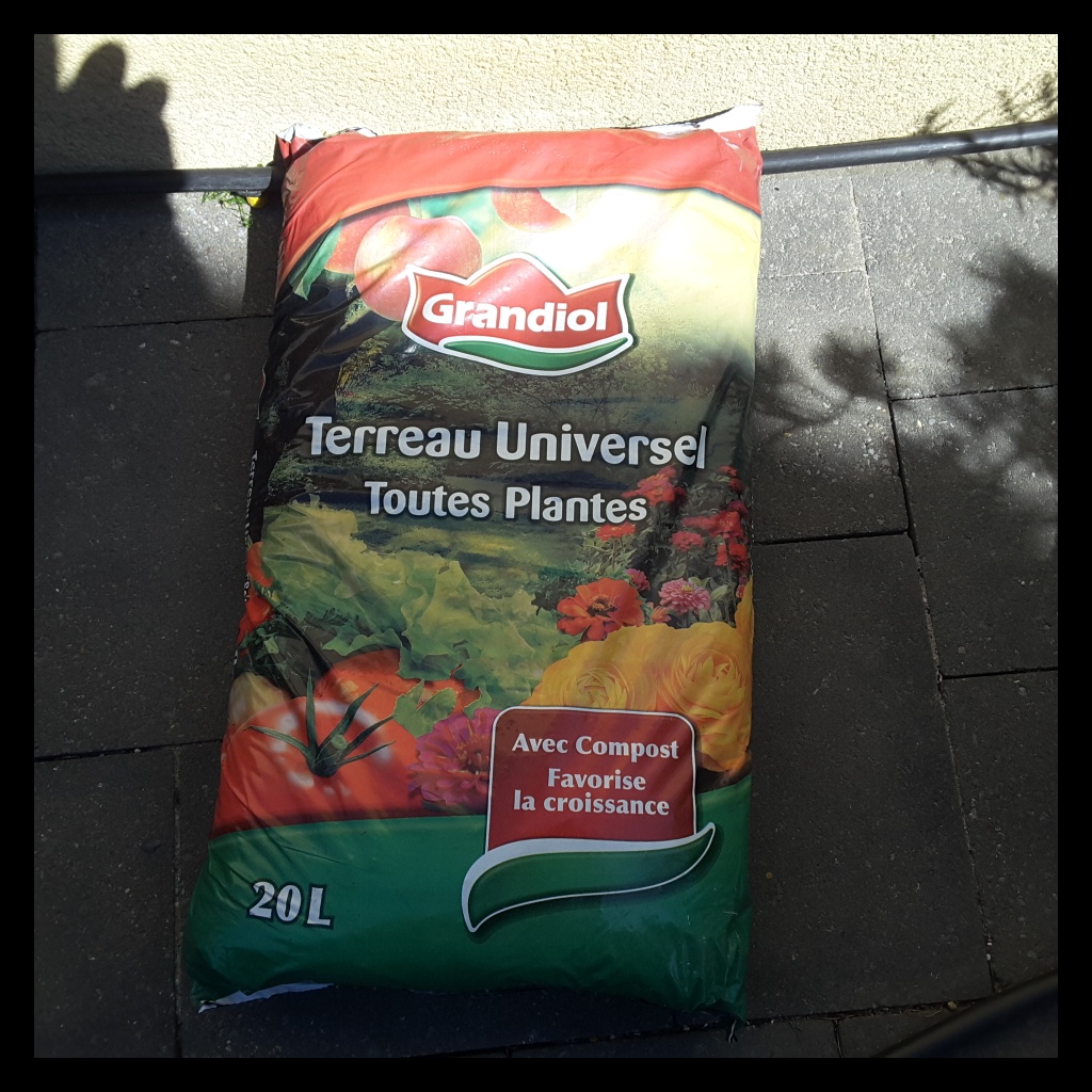 Je l'ai donc enlevé de son pot, bien rincé les racines pour enlever la terre, et mis dans le pot vert (20L) avec un nouveau terreau (des billes d'argile dans le fond) et je l'ai arrosé "un peu" en attendant ce soir que le soleil se couche.