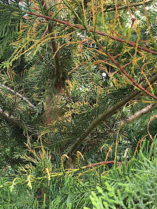 grâce au confinement, j'ai pu constater que ma haie de Leyland ne va pas si bien. Je l'ai planté il y a déjà (!) 4 ans pour nous isoler rapidement de nos voisins qui nous dominent du haut d'un talus d'environ 2 m de haut, situé à deux mètres de cette haie. La séparation de propriétés est au milieu du talus: très pratique! Bref ils ont bien rempli leur fonction en atteignant maintenant près de 4 m de haut. Hélas les branches surtout intérieures comment à jaunir, se dégarnir et se transformer en un profil arêtes de poisson multicolores voir photos). Craignant le fameux chancre des Cyprès, j'en ai taillé un de façon drastique, mais les autres sont atteint plus ou moins, du même symptôme…