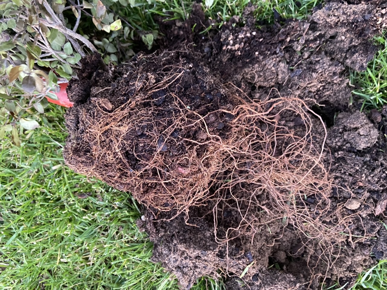J’ai eu peur d’un excès d’eau donc j’ai déterré la motte qui est friable, les racines sont sèches et n’ont pas l’air pourries.