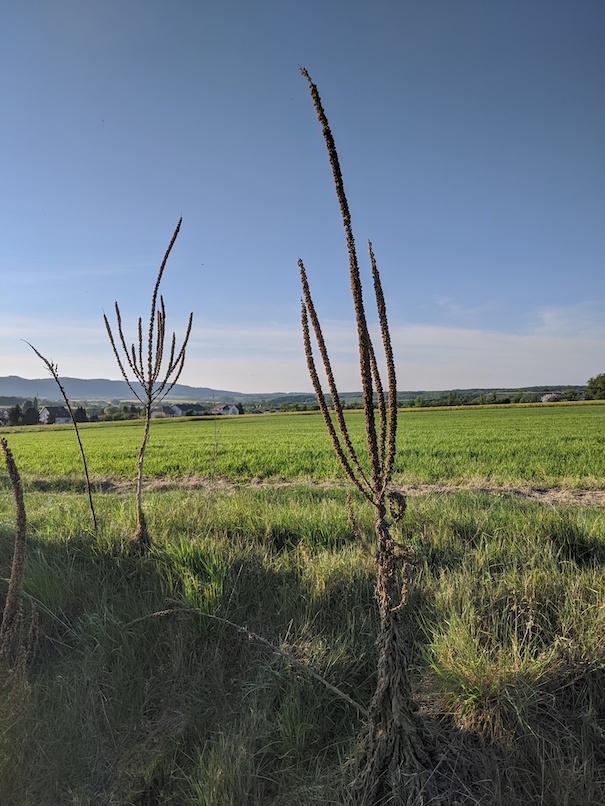 Je pense à Verbascum thapsus, la molène bouillon-blanc. Si c'est cette plante, elle est bisannuelle, donc elle meurt après la floraison qui a lieu en 2ème année. Sa descendance est probablement en train de pousser dans le secteur.