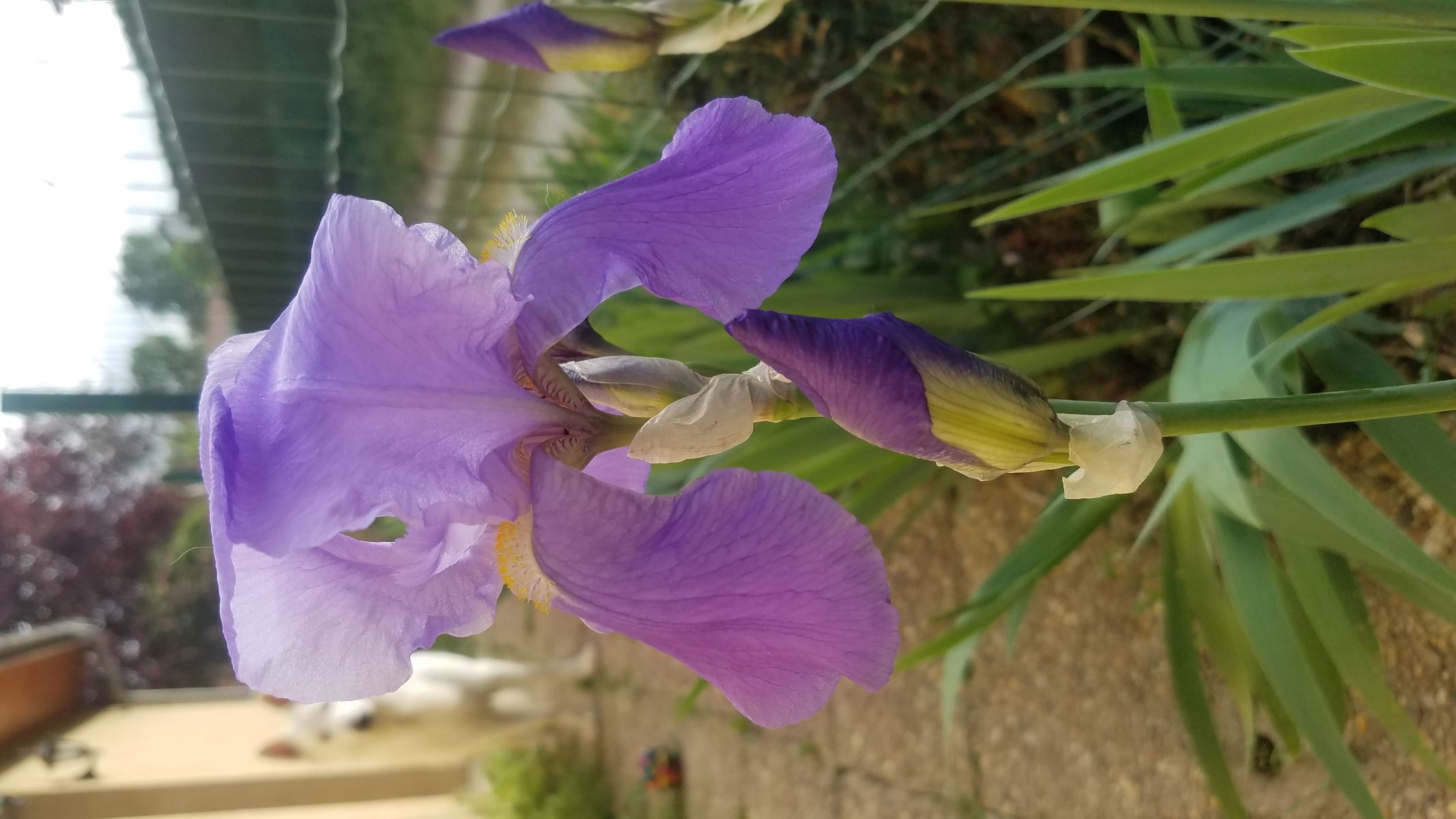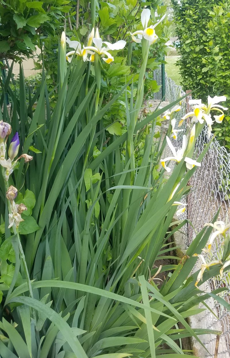 Voici l'iris bleu nuit que je soupçonne d'avoir fricoté avec un iris commun bleu clair et d'avoir engendré cet iris d'un bleu plus soutenu, né en 2013. Je l'avais récupéré au milieu d'une rangée de framboisiers où il s'était égaré. Je l'ai transplanté, puis il s'est multiplié et j'ai pu en transplanter en différents endroits du jardin.