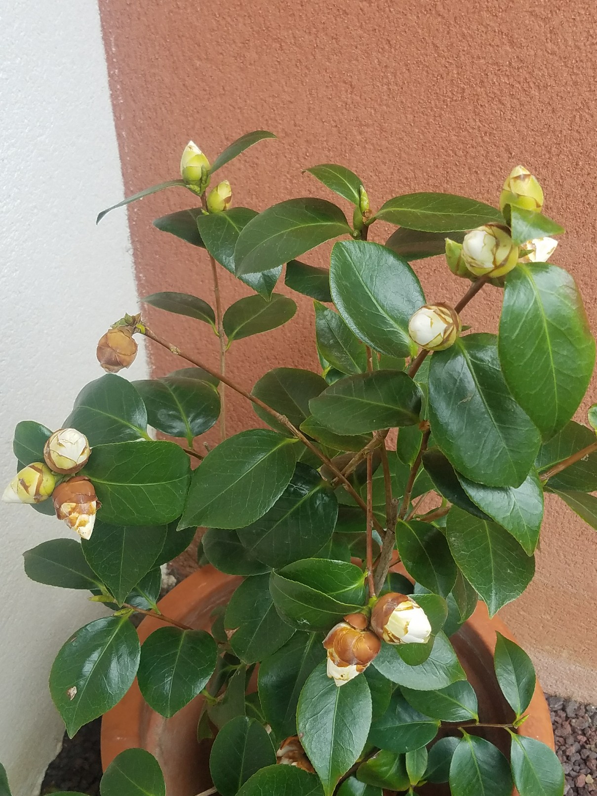 Cependant j'ai un problème, à part deux trois fleurs qui sont arrivées à maturité, tous les autres bourgeons commencent à devenir marron. Certains sont tombés ainsi que quelques feuilles.