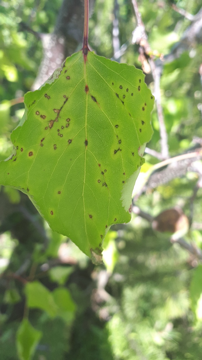 Il y a des petits points noirs sur le feuilles, qui rappelle la criblure à cornélyum, mais je ne suis pas sur que se soit cela. Il y en a aussi sur les fruits, et ça varie de rien du tout à un fruit couvert de point. Autre fait étrange, la partie haute de l'arbre est intacte, alors que le bas, surtout les fruits, est très attaquée.