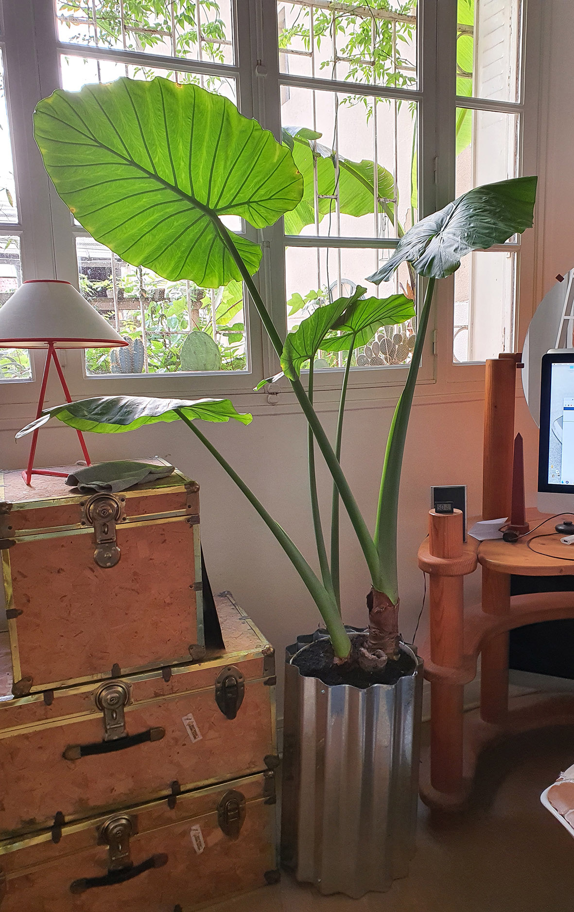 J'ai acheté une grande alocasia chez un particulier à l'automne dernier. Elle se portait très bien, pleine lumière près de la fenêtre. Elle suintait le soir. Elle a fait une nouvelle feuille à chaque tronc.