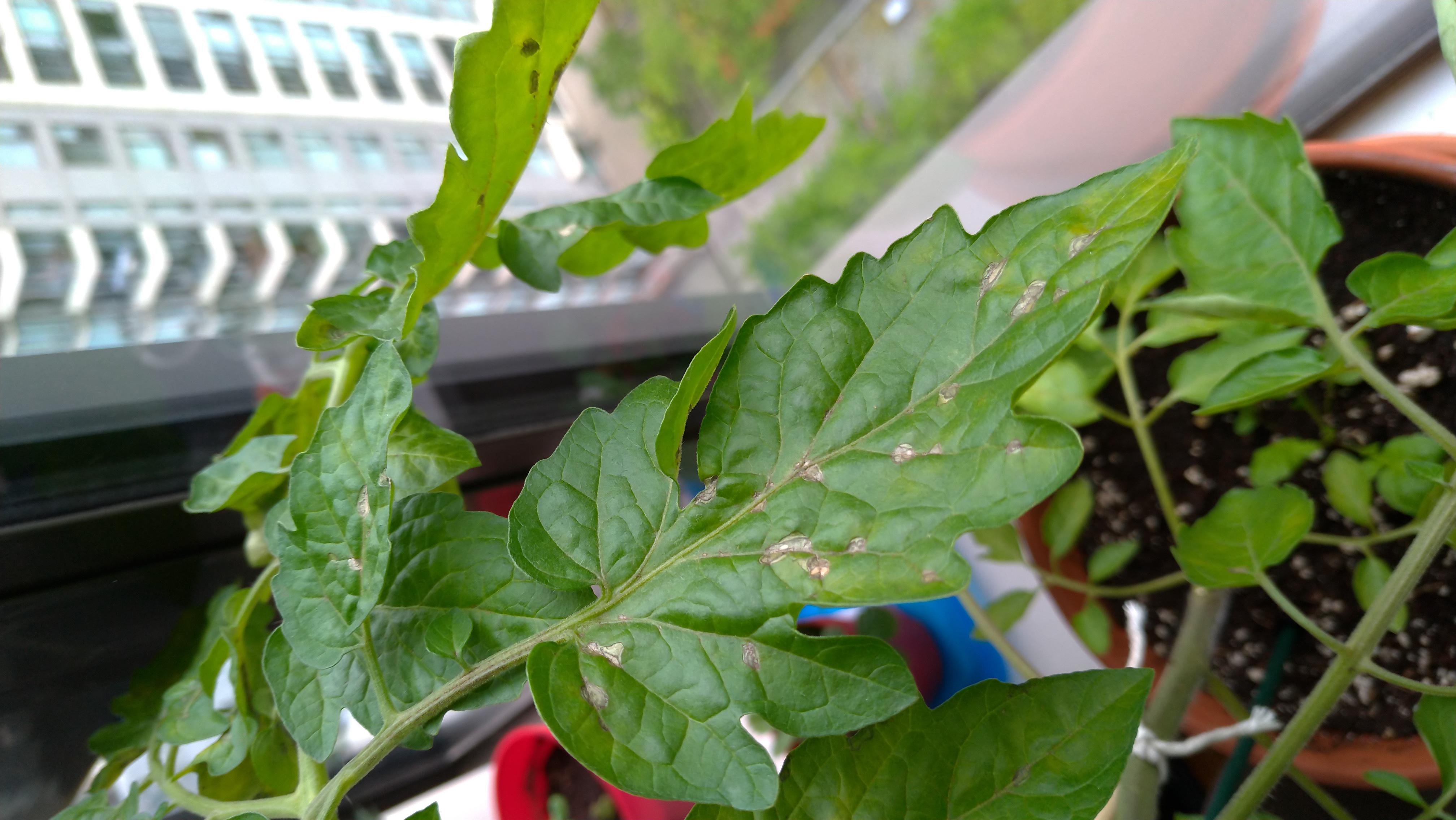 J'ai un plant de tomate cerises en pot qui a très bien grandit, fait des fleurs mais depuis 2-3 jours, des tâches, d'abord claires, puis qui brunissent, apparaissent sur les feuilles (pour l'instant uniquement les feuilles les plus anciennes, en "bas").