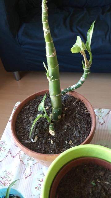 Voici la plante il y a quelques mois : La voici aussi, en arrière plan. Désolée pour la qualité, ce sont les deux seules photos d'elle que j'ai lorsqu'elle allait bien : Voici son état actuelle. Elle a la tige jaunit et plus aucune feuille : C'est une plante que j'ai eu en pot et que j'ai rempoté il y a 6 mois, mais elle n'avait pas l'air d'en avoir trop souffert. Elle mesure une vingtaines de centimètres. Elle n'a jamais eu de fleures et je l'ai depuis plusieurs années.