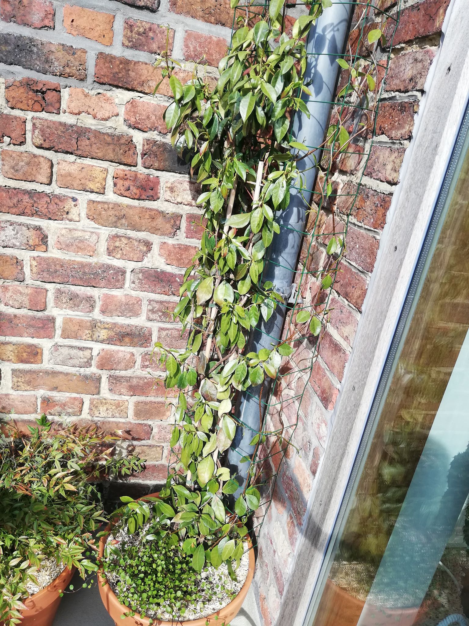 Je m'adresse à vous pour vous demander conseil pour mon jasmin étoilé planté en pot sur mon balcon il y a un an et qui s'était bien développé l'été dernier. Je me trouve en Belgique, mon balcon est orienté au nord ouest, la plante bénéficie de 5h d'ensoleillement environ (+/- 15h30 à 20h30 à la belle saison). Il est relativement à l'abri du vent grâce à un mur (photo). Le pot en terre cuite de 40cm est percé et drainé à l'aide d'une couche de billes d'argiles.