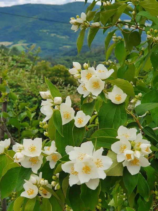 ici le seringat commence juste sa floraison avec son parfum entêtant