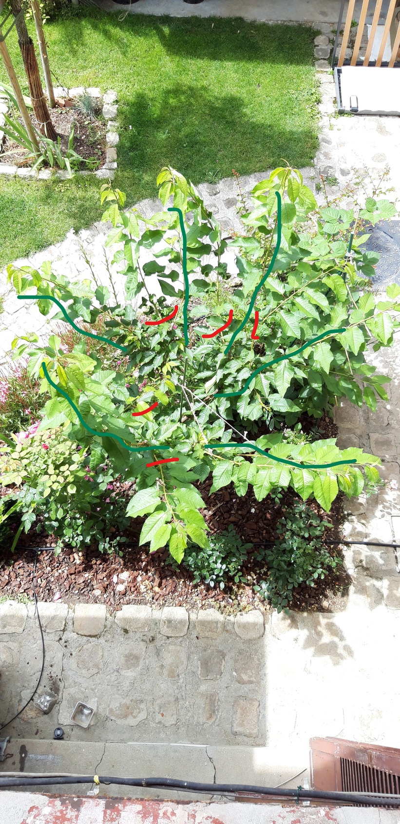 - simplifier/renforcer encore plus la ramure en supprimant la moitié des branches à la base (en laisser 6-7) et en raccourcissant ceux qui restent à environ 1m70 du sol.