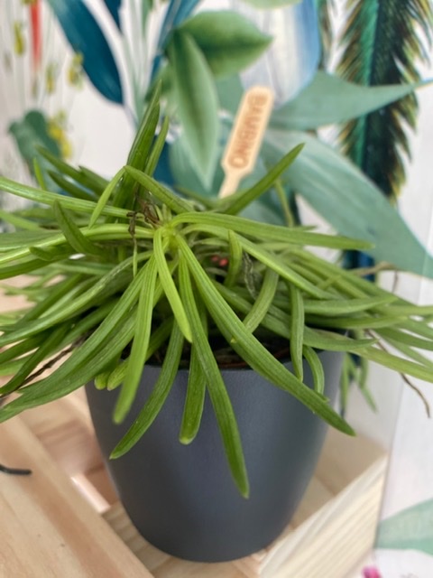 Ca pourrait être un Peperomia ou un Senecio... Quoi qu'il en soit en regardant les feuilles on voit qu'elles sont assez épaisses, donc conçues pour "stocker" (un peu comme un cactus, une succulente...). Ca veut dire que c'est une plante qui ne s'arrose pas très souvent et qui apprécie une bonne luminosité. Et comme pour toutes les plantes il lui faut un pot percé si ce n'est pas déjà le cas.