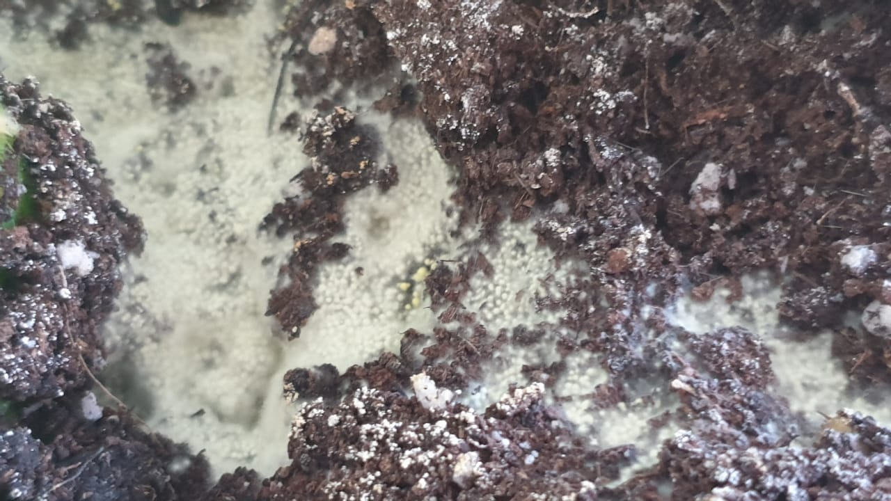 Bonjour, des milliers de petits œufs blancs sont apparus à la surface de la terre dans des pots à l'intérieur de chez moi...