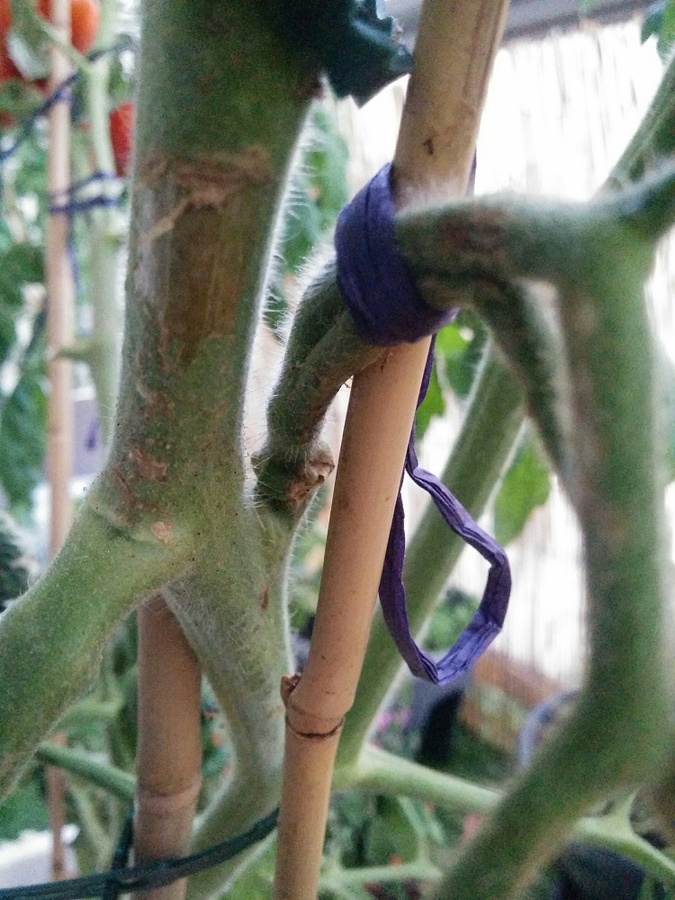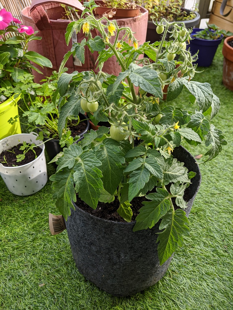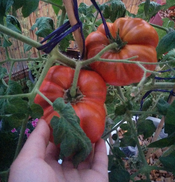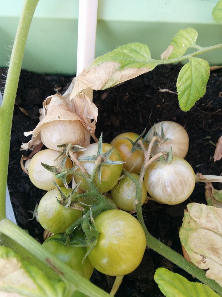 - Les tomates. Semées fin mars à l'intérieur en godet ou bouteille, et rempotés mi-mai. J'avais choisi des variétés naines ("dwarf") "adaptées à la culture en pot". Pour les tomates cerises (Anmore dewdrop, Lille lise), ça c'est plutôt bien passé. Pour les autres (Detsky, Tasmanian Chocolate, Babylons Glow), certaines ont eu les feuilles brûlées, mais aussi des fruits (devenus tout blancs et secs). Les deux plus grandes faisait 1-1.20m, et étaient dans des pots en plastique de 20-25L. Elles se sont renversées plusieurs fois, avec des branches cassées. J'ai récolté plusieurs gros fruits, mais il a fallu trop d'effort pour les maintenir en vie : cette année, je n'ai replanté que des naines.