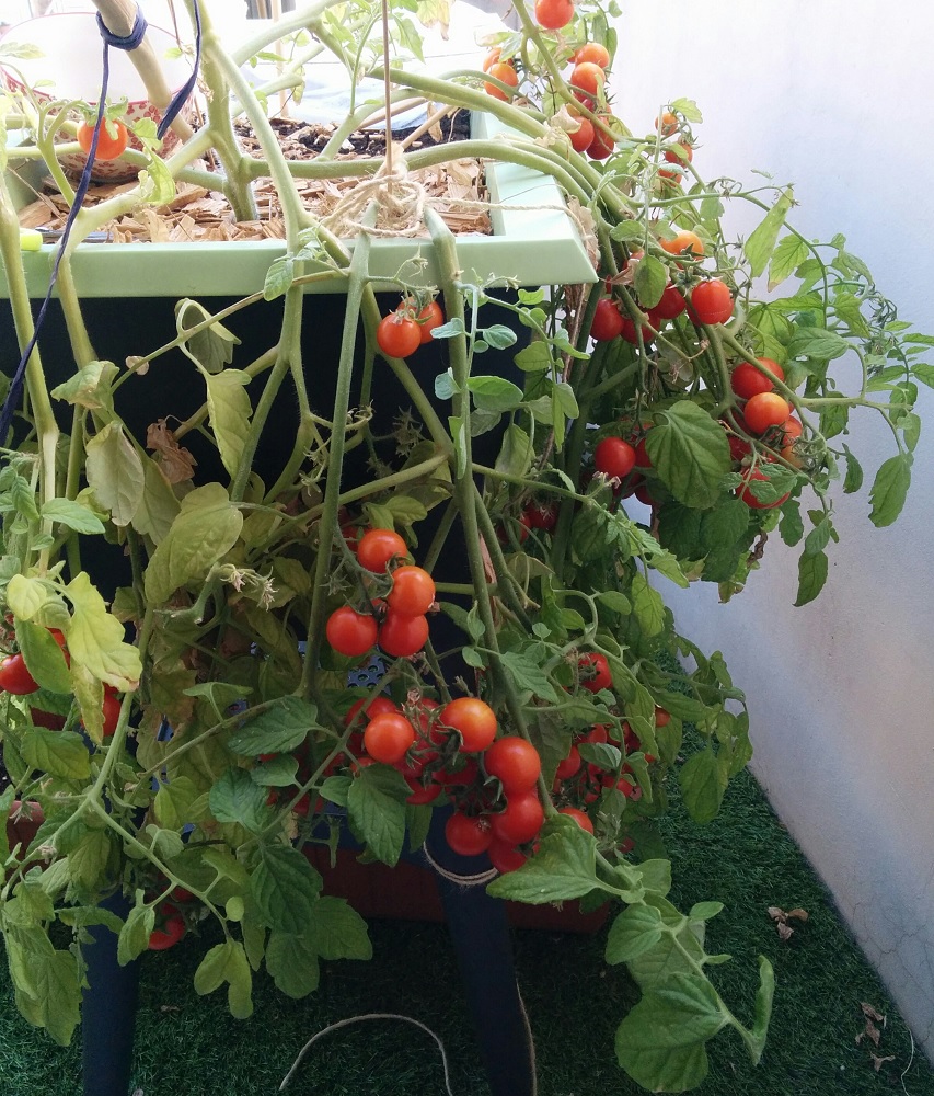- J'ai aussi une jardinière à réserve d'eau, 40L : vraiment bien pour l'été. J'y ai mis un pied de tomate cerise retombante "anmore dewdrop", qui a été très productif de juin à juillet. Par contre, la corvée de nettoyage en fin de saison est moins drôle... Cette année, j'y ai mis des fraisiers (bien), de la coriandre (à éviter), des oeillets (bien), et des tetragones cornues (à voir d'ici quelques semaines).