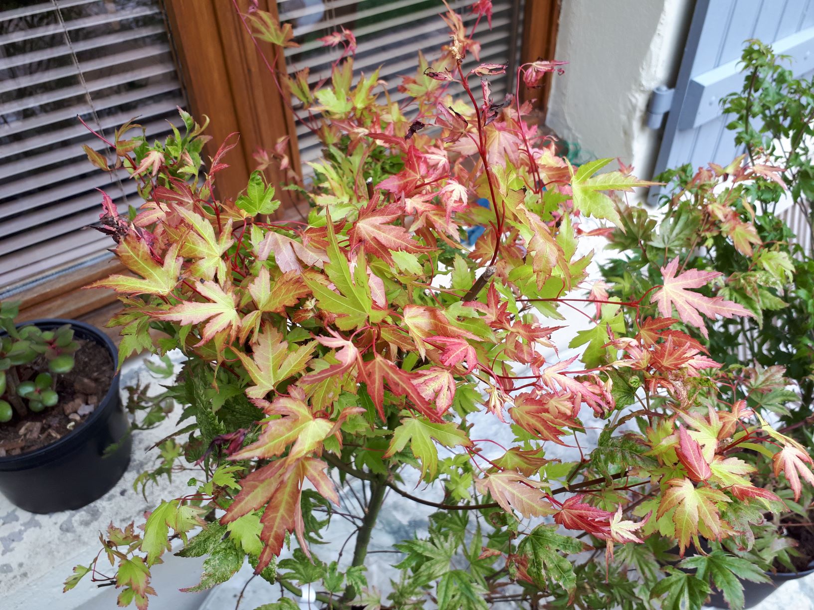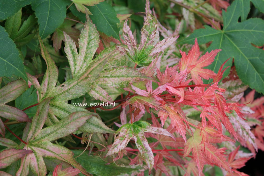 Voici une variété toute récente, proche de 'hino tori nishiki' (oiseau de feu), 'phoenix', ou encore 'Johnnie's pink' (du nom de son créateur Harold Johnson de l’Alabama). Il y a très peu d'info à son sujet (c'est une sélection japonaise), mais ses couleurs au printemps sont sublimes ! Au printemps il débourre rose vif-rouge, puis devient progressivement vert avec de nouvelles pousses rose-rouge. A l'automne, selon son exposition, il vire orange-rouge plus ou moins vif. Je met une photo de mon sujet au moment du déballage (les feuilles sont encore un peu chiffonnées) et, comme à l'habitude, quelques photos du type à divers moments de la saison. Je compléterais la fiche progressivement.