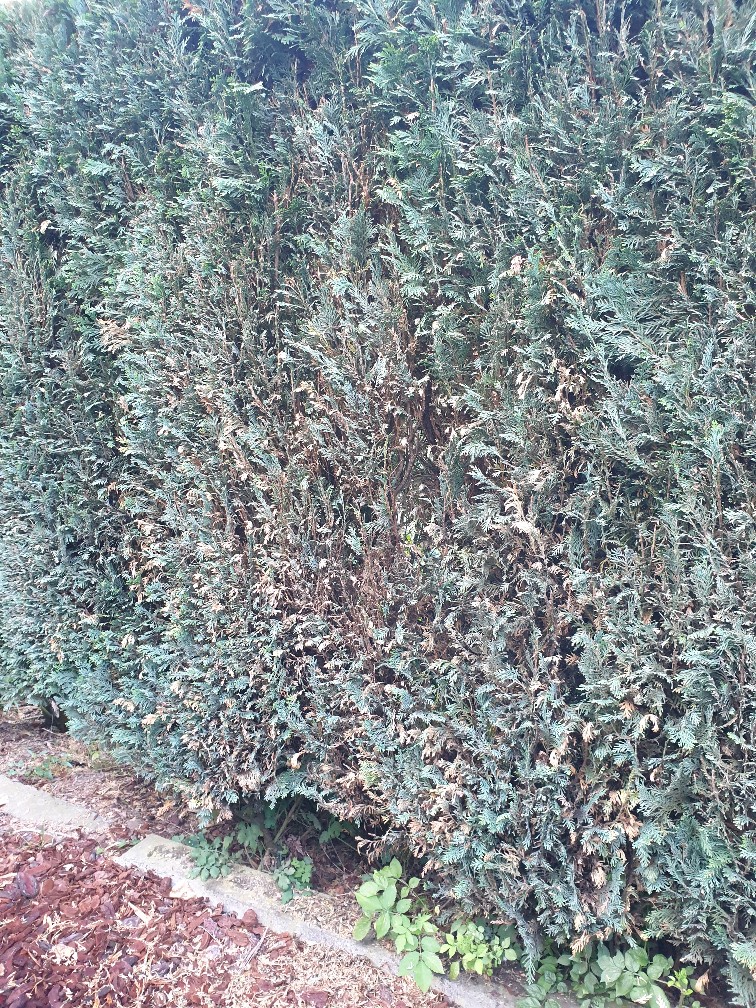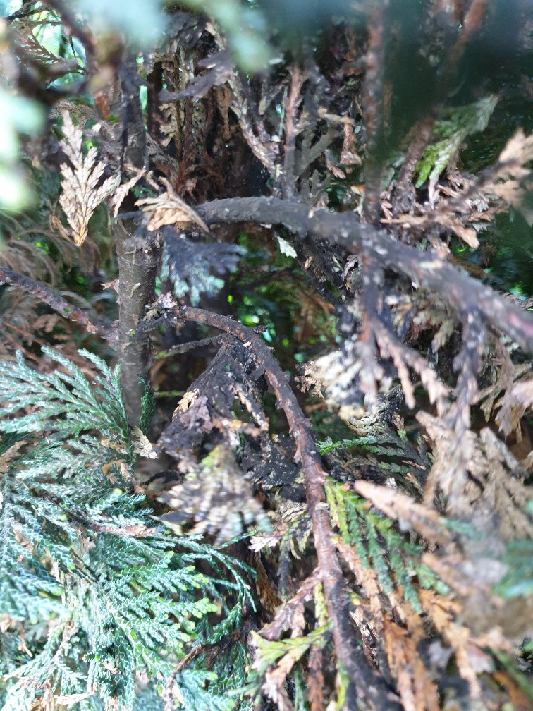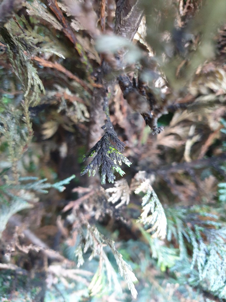 Bonjour à toutes et tous. J'ai un plan de haie de thuyas qui est attaqué par ce qui m'a l'air d'être un champignon. Certaines branches et feuilles deviennent noires. C'est en écartant les branches d'une partie très limitée de haie qui bruissait légèrement que je l'ai remarqué.
